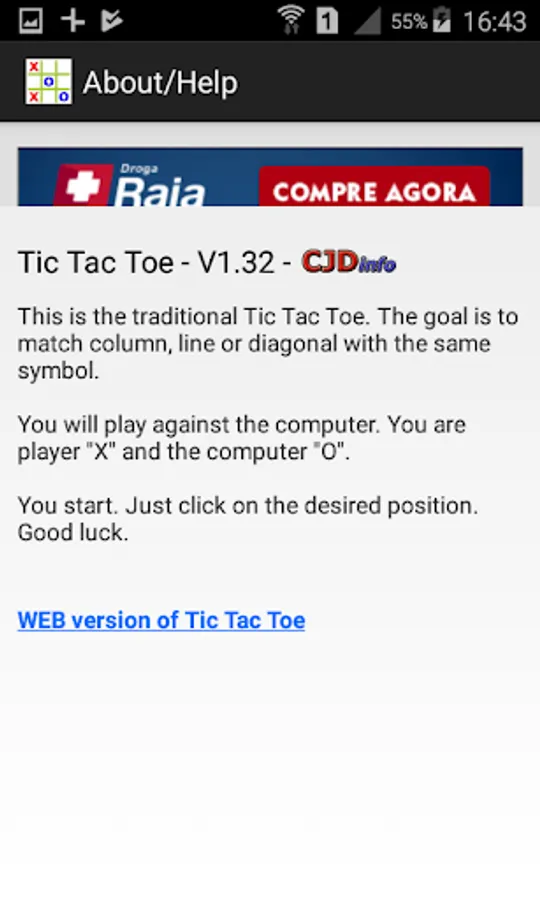 The traditional Tic Tac Toe game. The goal is to match column, line or diagonal with the same symbol. Play against your computer.
