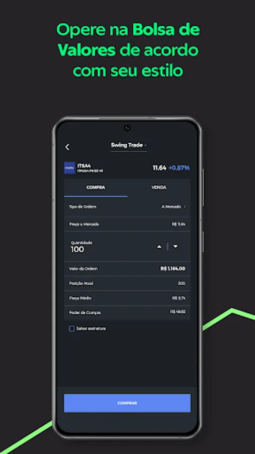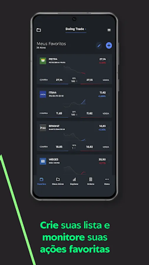 Swing Trade is intended for the purchase and sale of shares, ETFs, FIIs and options listed on B3. It is recommended for those who operate in the short, medium and long term and less frequently.