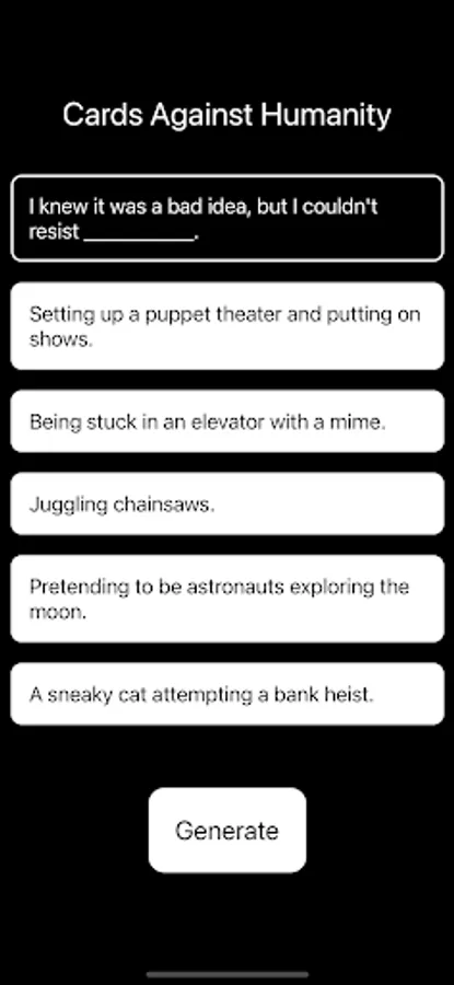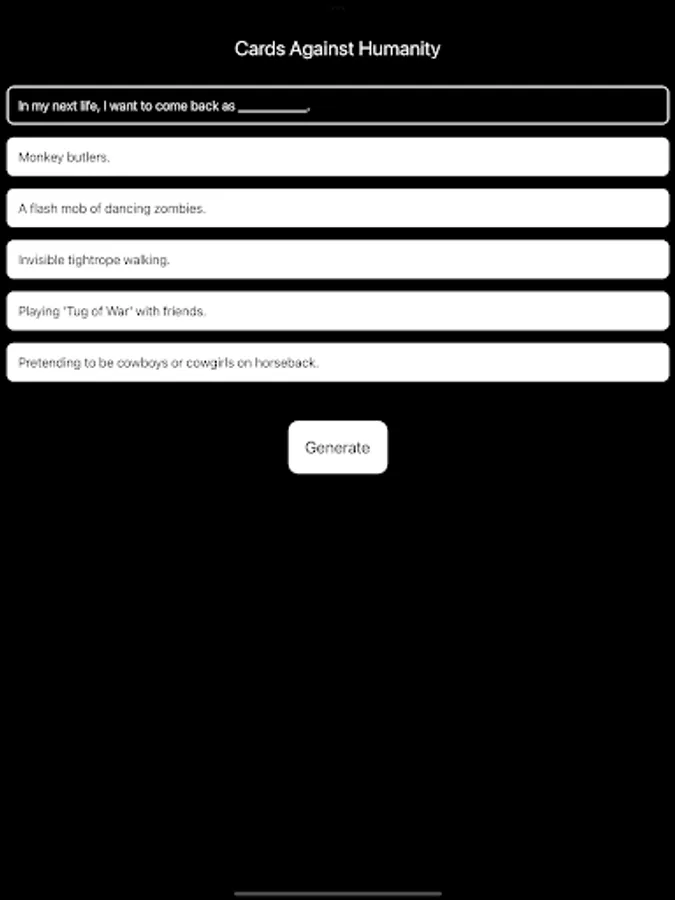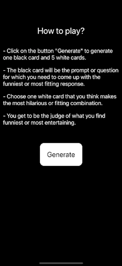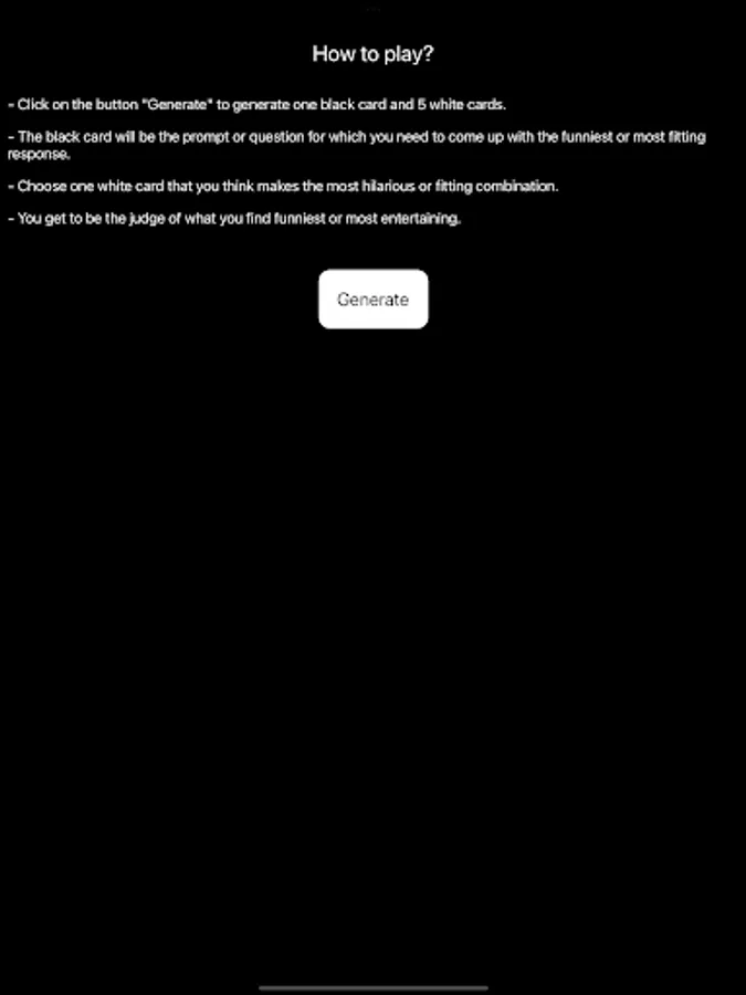 It's a popular party game known for its dark and often offensive humor, and it is intended for mature audiences. It is played with a set of black cards containing fill-in-the-blank phrases and a set of white cards with various words or phrases. Players take turns being the "Card Czar," who reads a black card with a fill-in-the-blank statement, and the other players submit their funniest or most fitting white card to complete the sentence.