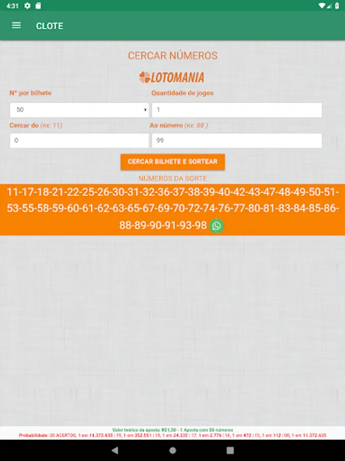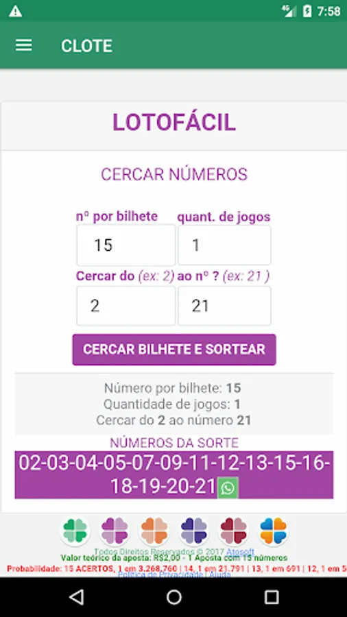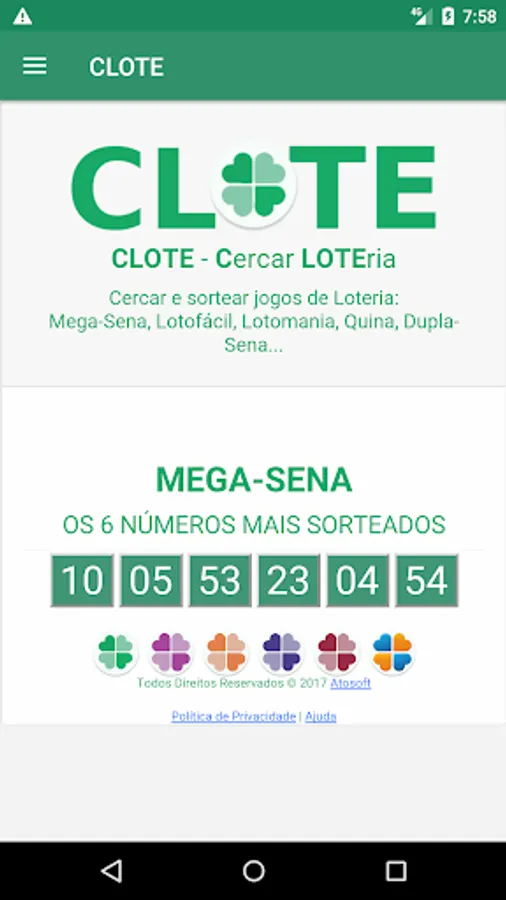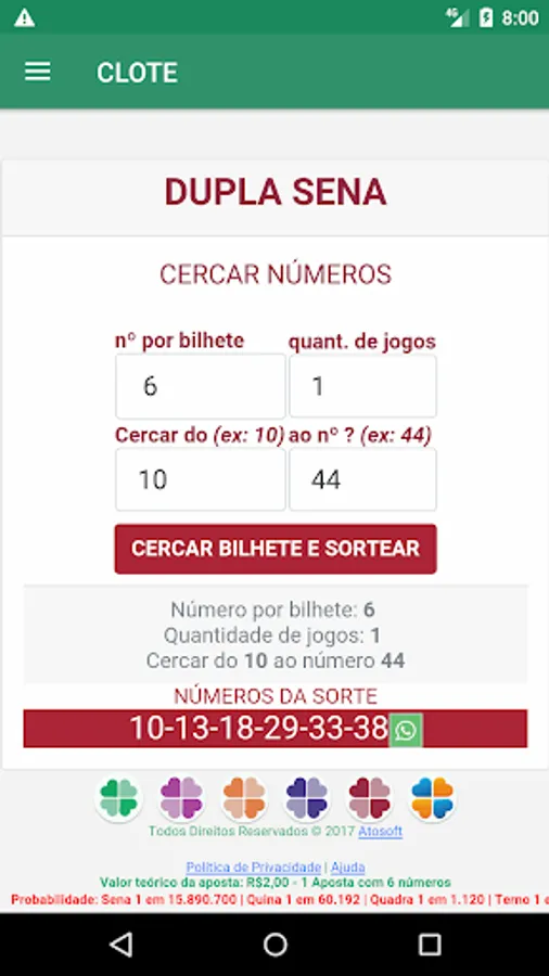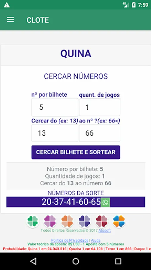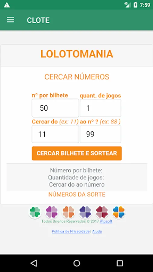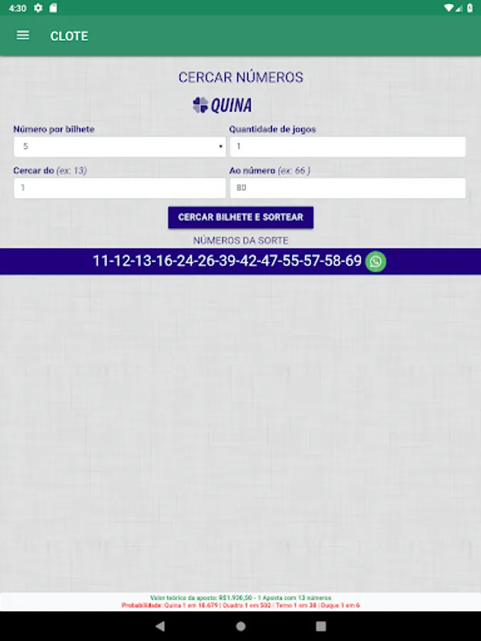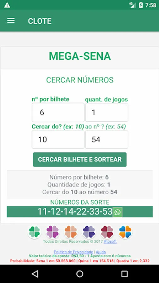 Surround and generate combinatorial number of Mega-Sena, Lotofácil, Lotomania, Quina, Dupla Sena and other customized numbers.