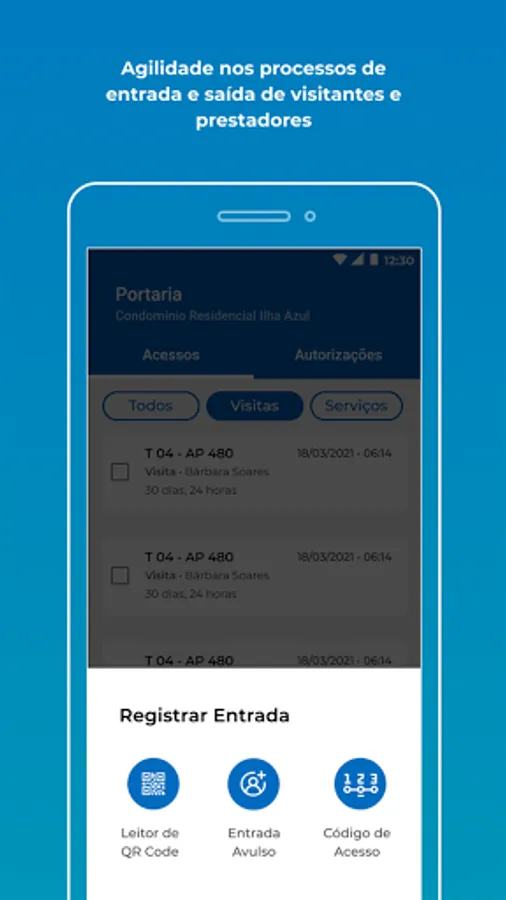 - Registration of access of visitors and providers, by reading QR code or numeric code;