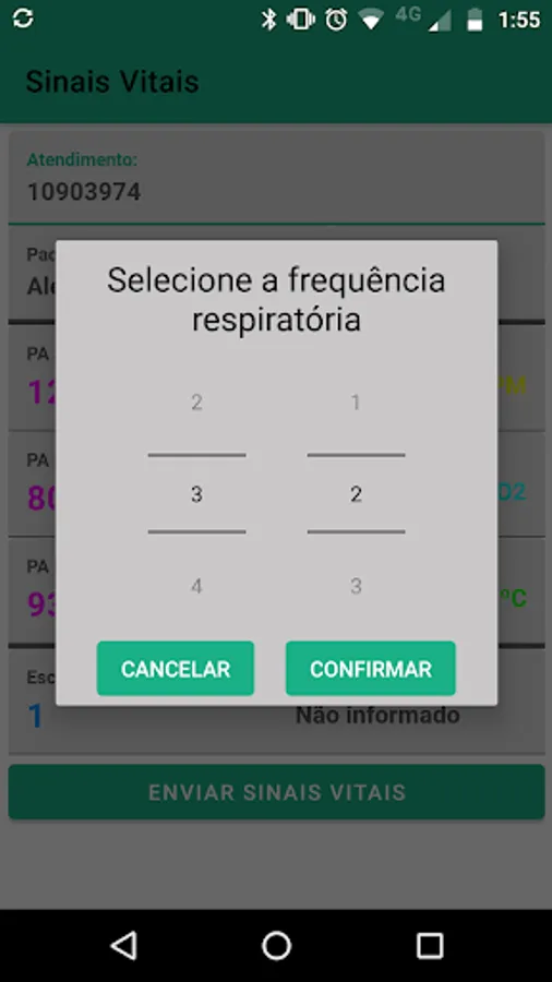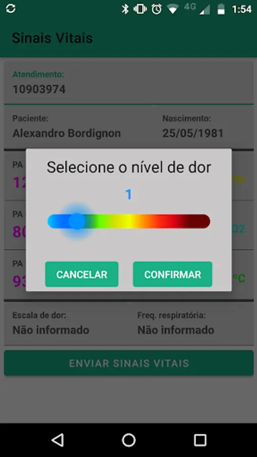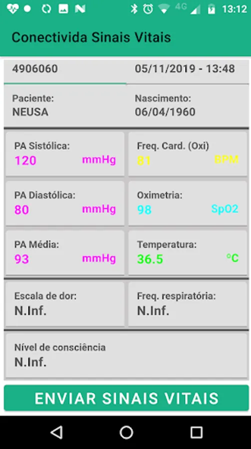 In the app, the user who performed the measurements identifies himself (by user and password), complements it with other vital signs not available on the equipment (respiratory rate, pain scale, etc.) and then sends it to the HIS (Hospital Information System).