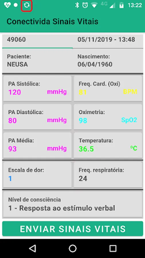 The app receives vital signs (Pressure, Oximetry, Temperature, among others) and the patient's identification code.