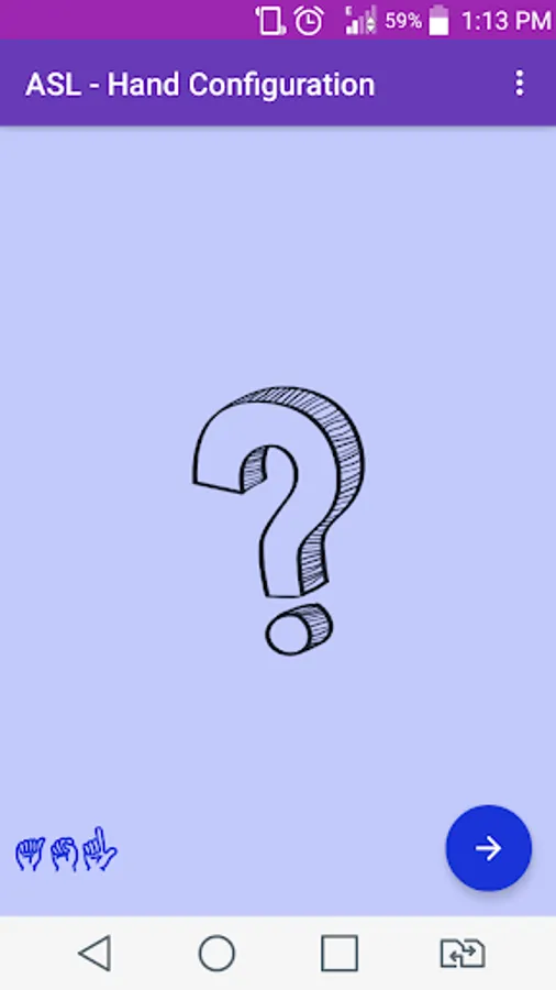 2 - Then, press the button with the drawing of an arrow pointing to the right, and a hand configuration in ASL will be shown on the screen;