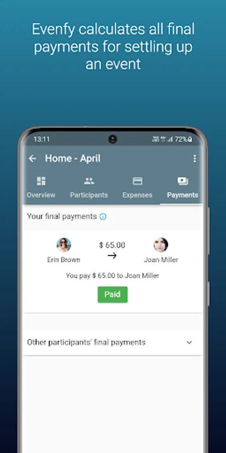 - Close the event and know who pays whom in an optimized way