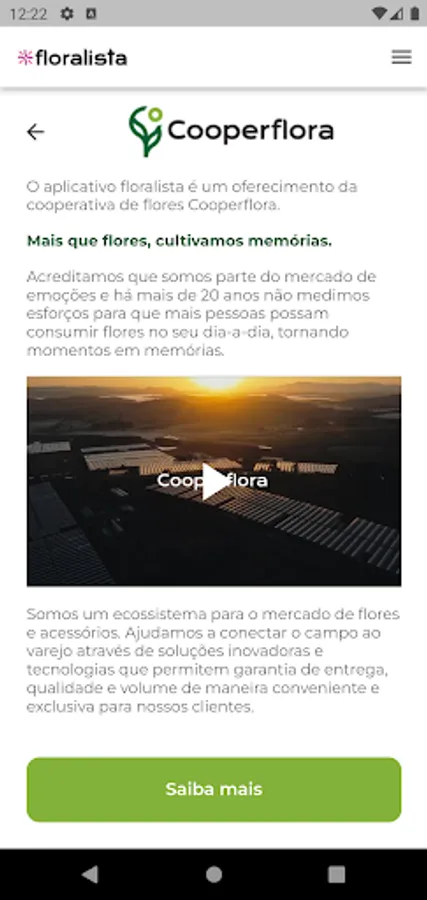 The Floralista application is offered by the Cooperflora flower cooperative in Holambra-SP. With this app, you can access the cooperative's flower catalog, as well as stay on top of market news, meet our producers, get inspired and create collections that can be shared. It is an excellent tool for flower shops and florists to organize their project ideas with the best flowers on the market. It is also an application for flower enthusiasts and lovers, as well as enabling wholesalers and retailers to experience a world of flowers in the palm of their hands.