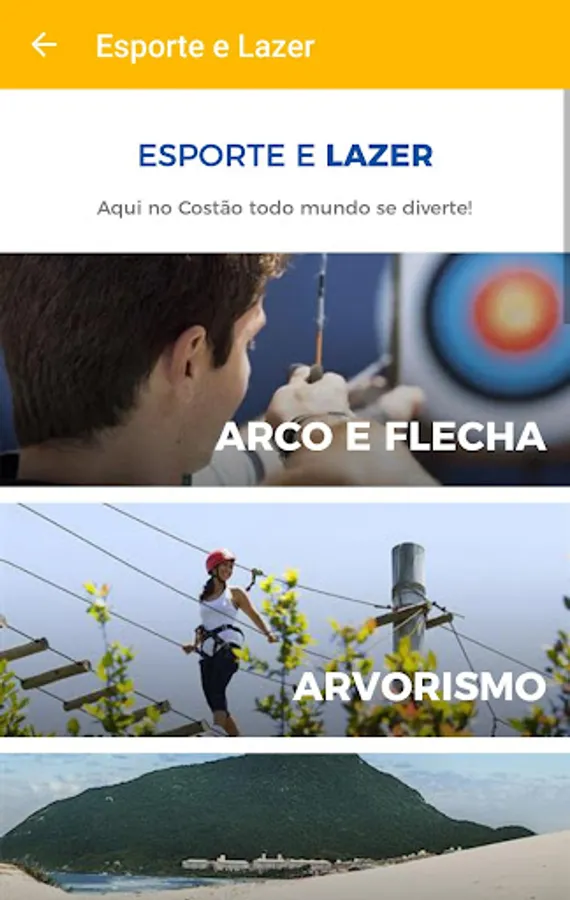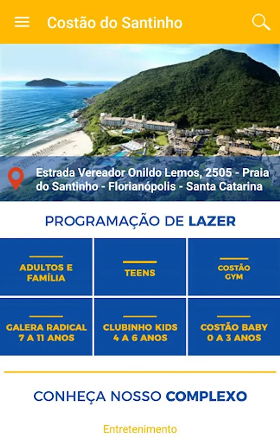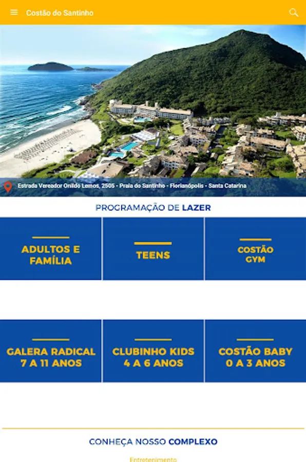 Access the Schedule Sporting Goods, divided by age group, with times and locations. The activities can be searched by type of audience (kids, teens, adults), time, type of activity (games, water, etc.) or theme. You may signal what activities will like to participate and these activities will be included in the application FAVORITES area. Before the start of this activity, you will receive a notification alerting the start with 15 minutes in advance.