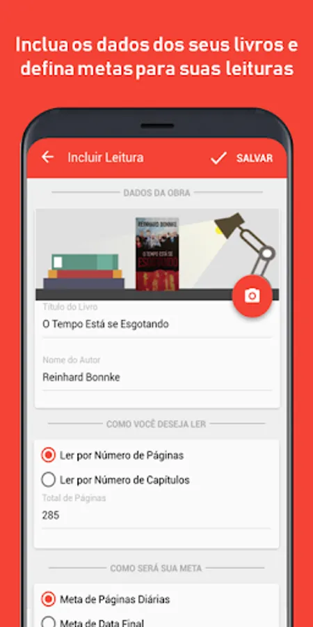 For this, it allows the registration of the books that you are reading or want start to read, be it digital or physical, it starts when the user add a book by entering its total number of pages, picture of the cover(optionally), so the user insert when he wants to finish his reading so the application will show how many pages the user has to read or the user can insert how many pages he is able to read daily so the application will tell him when he is going to finish the book.