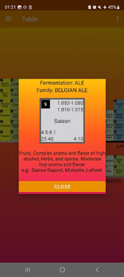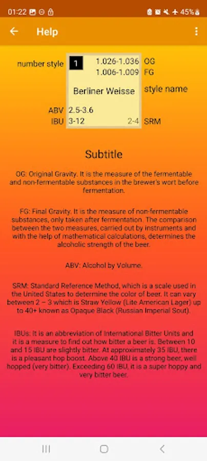 - In table mode has 65 elements behind SRM (color), ABV (alcohol), IBU (bitterness), OG (initial density), FG (final density) and a short style description with references of some commercial beers .