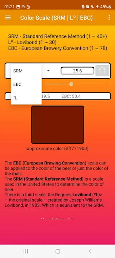 - Convert simple approximate color of beer between the scales: SRM (Standard Reference Method) <> EBC (European Brewing Convention) <> L (Lovibond).