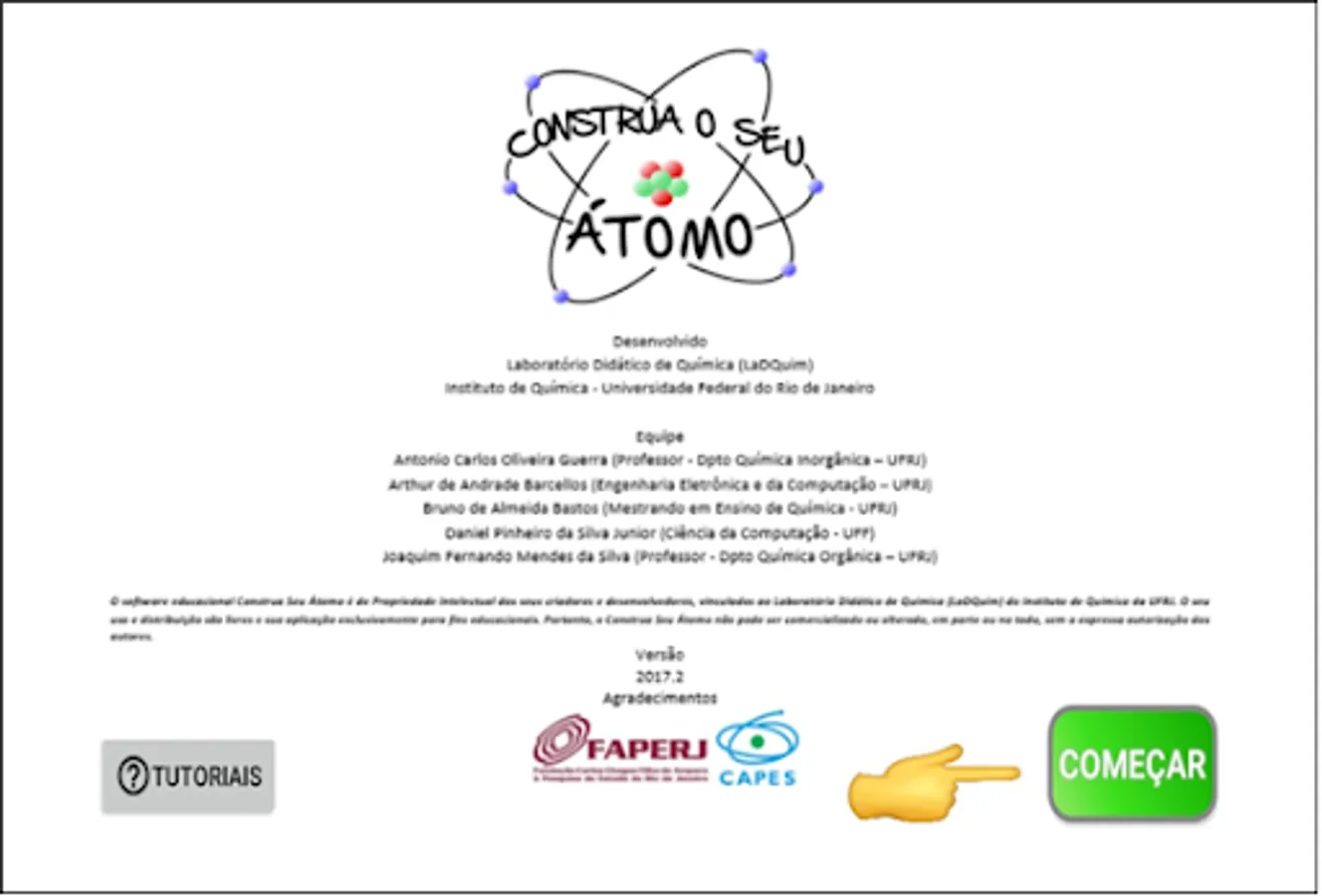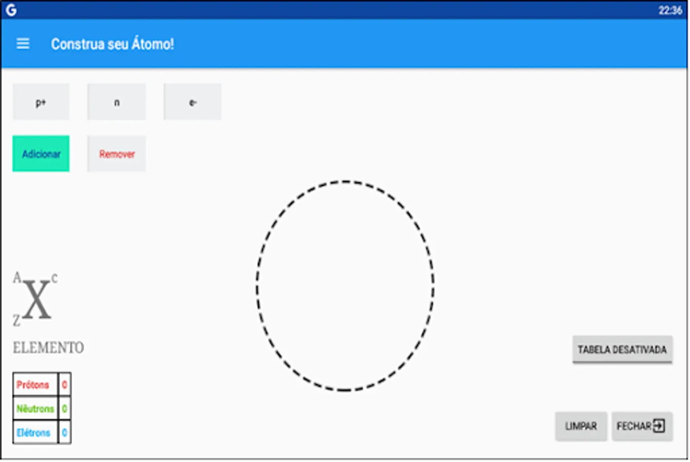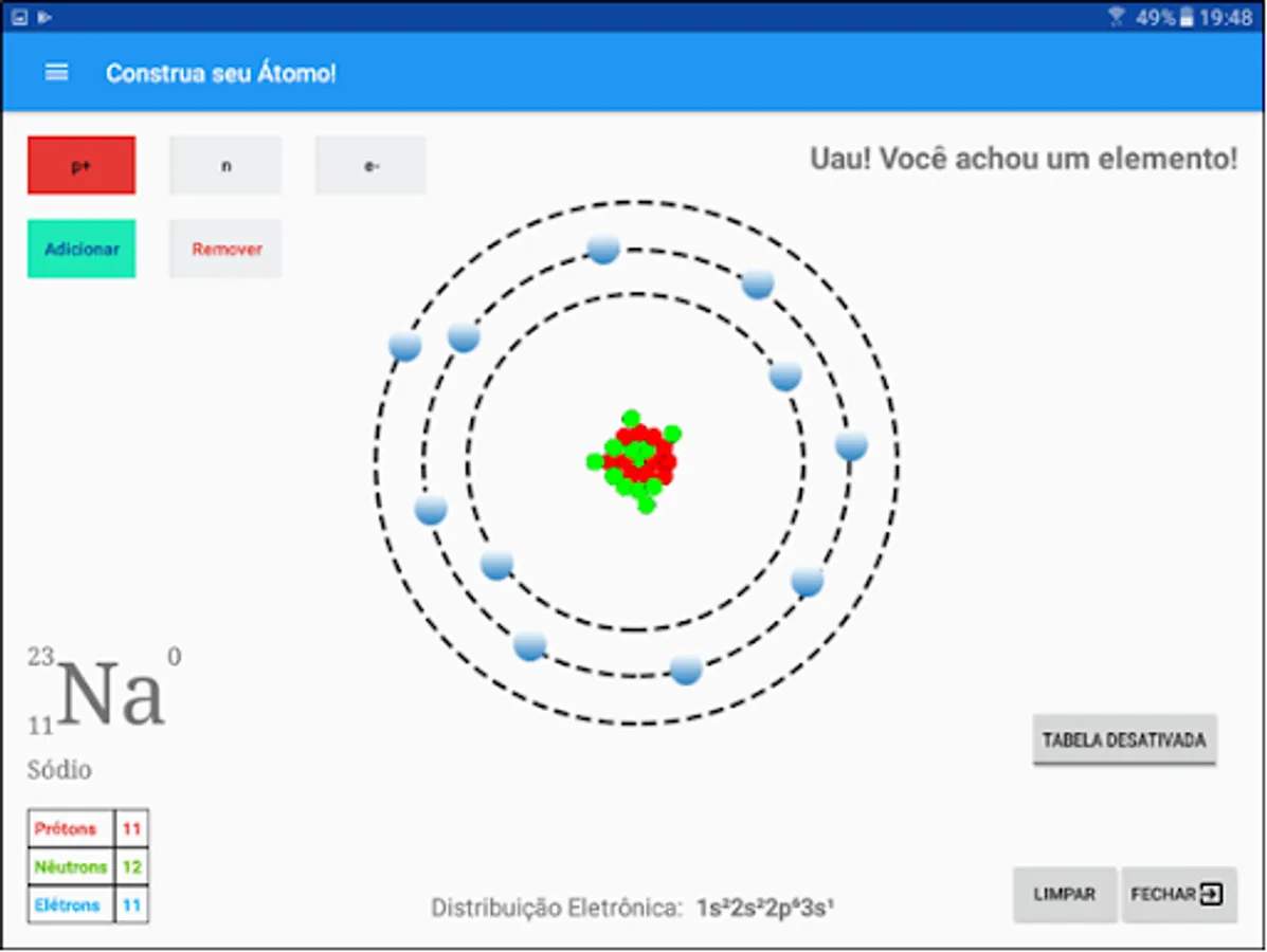 Welcome to the Build Your Atom app! Through the application, students will be able to represent the electronic structure of an atom, according to the atomic model of Bohr, adding or removing protons, neutrons and electrons. The representation allows students to check the number of protons, neutrons and electrons, the symbol and name of the chemical element, mass number, atomic number, charge and, finally, electronic distribution.