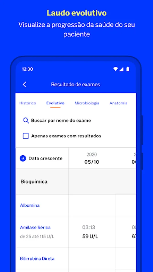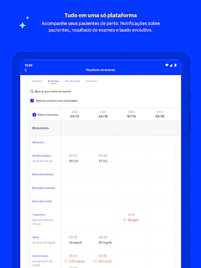 Have at hand the history of laboratory tests and images of your patients and visualize the progress of the exams with reference values.