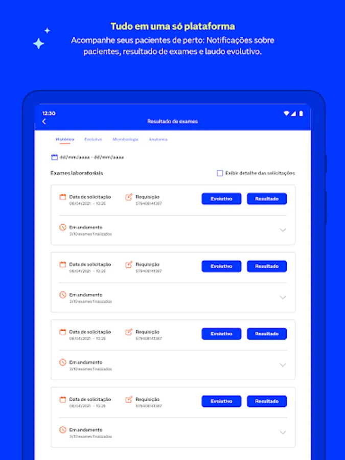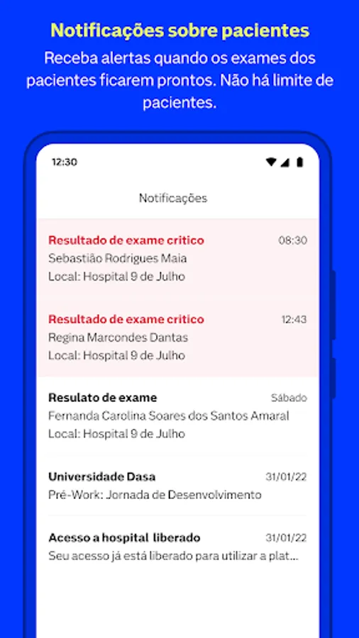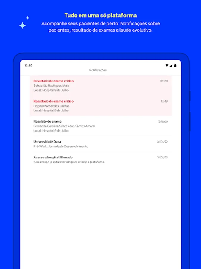 Nav Pro is a platform for healthcare professionals who need to track and view exam results in a practical, fast and accessible way. With Nav Pro it is possible to receive notifications about exams ready, view the history and evolution of the results of laboratory exams and images of a patient.