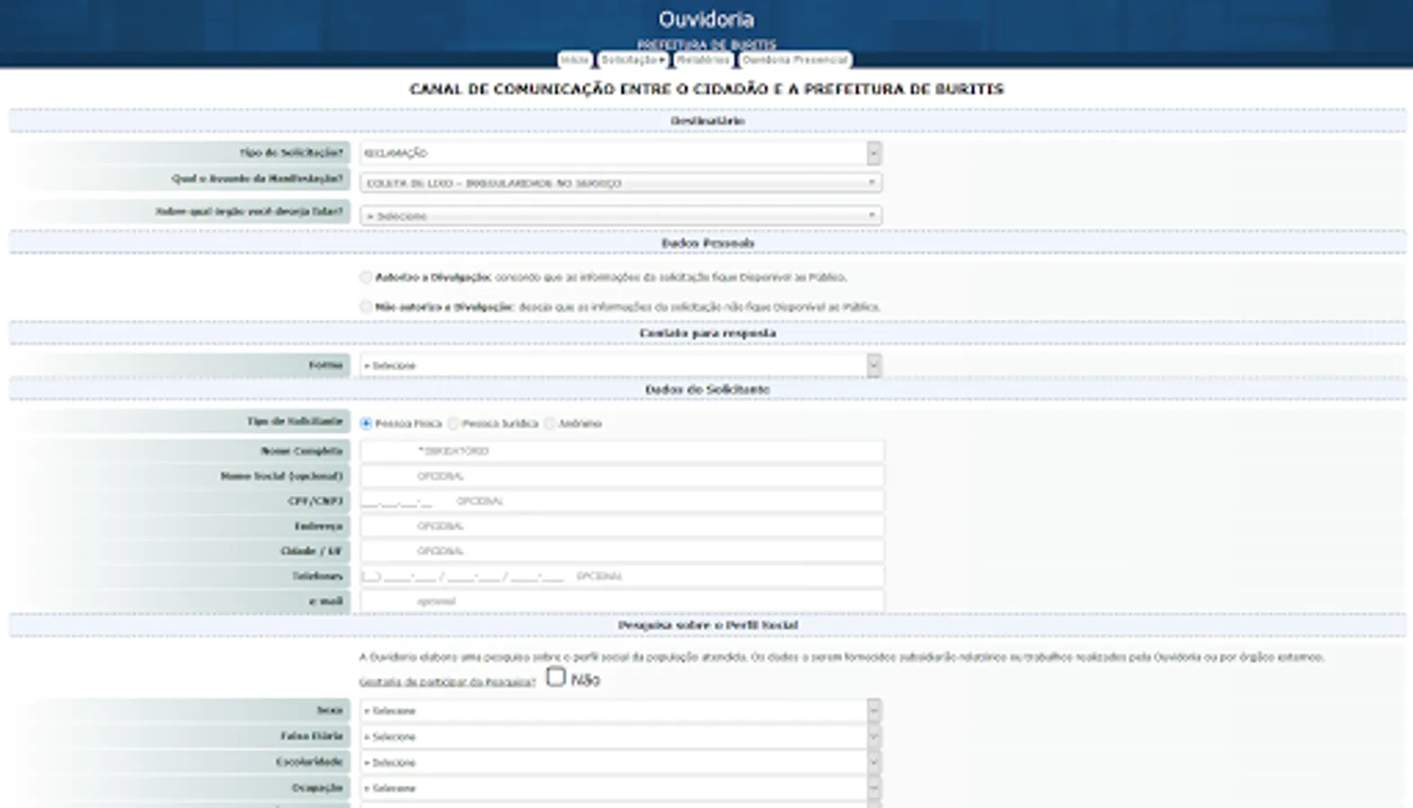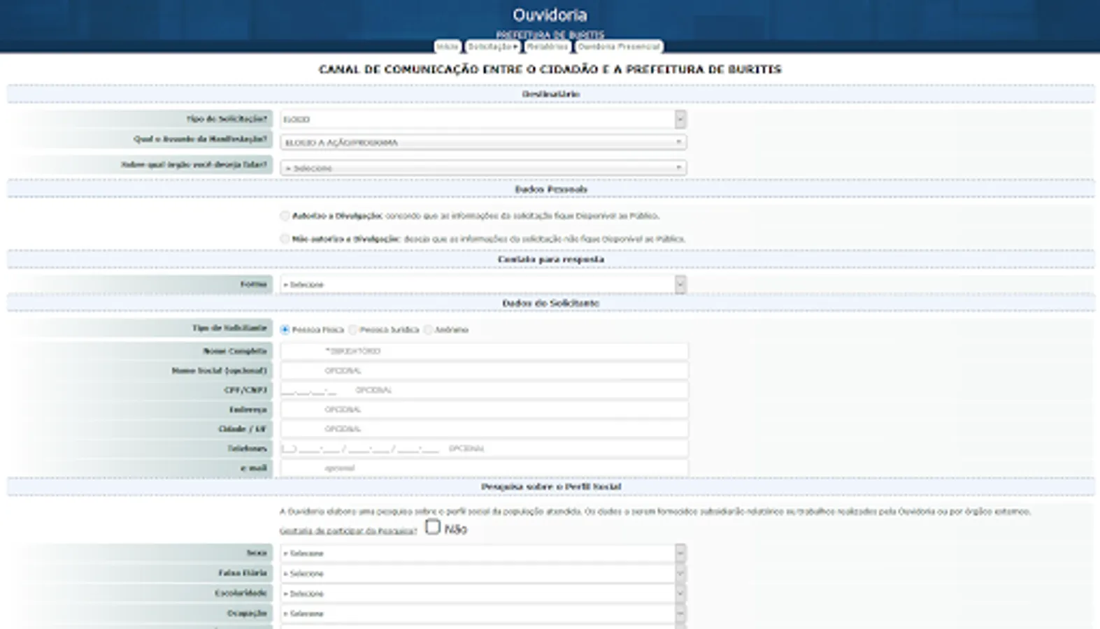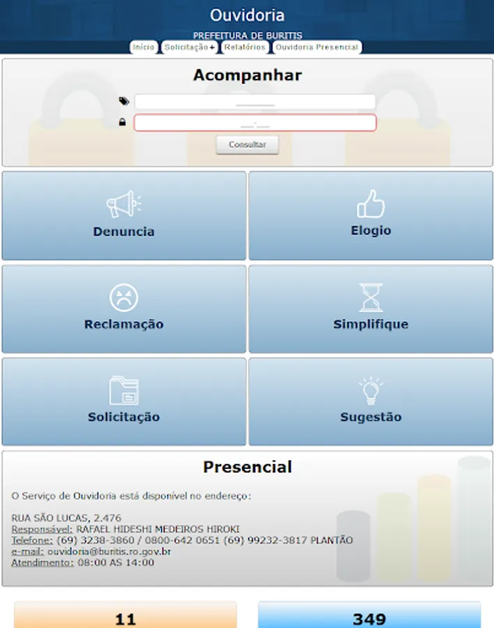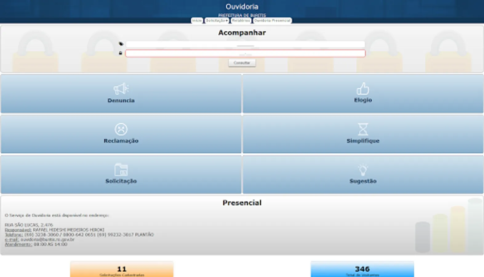 Ombudsman of the Municipality of Buritis-RO, a computerized tool of social control made available to the citizen. Through the Ombudsman's Office it is possible to clarify doubts, as well as forward complaints, complaints, suggestions and compliments, including attachments such as photos, documents, etc. The manifestations registered in this channel are directed to the Ombudsman and the citizen for follow-up.