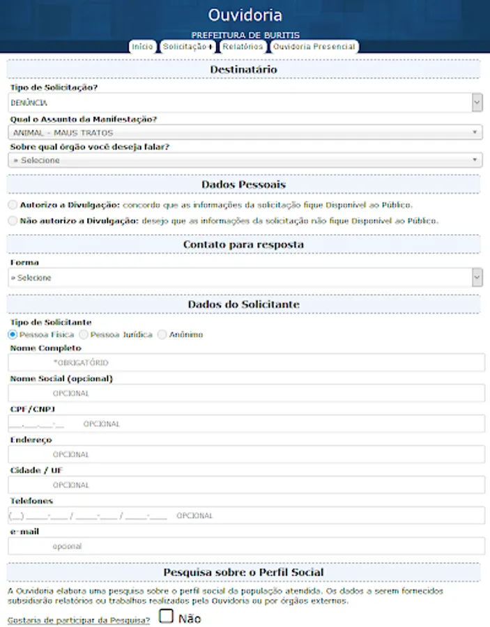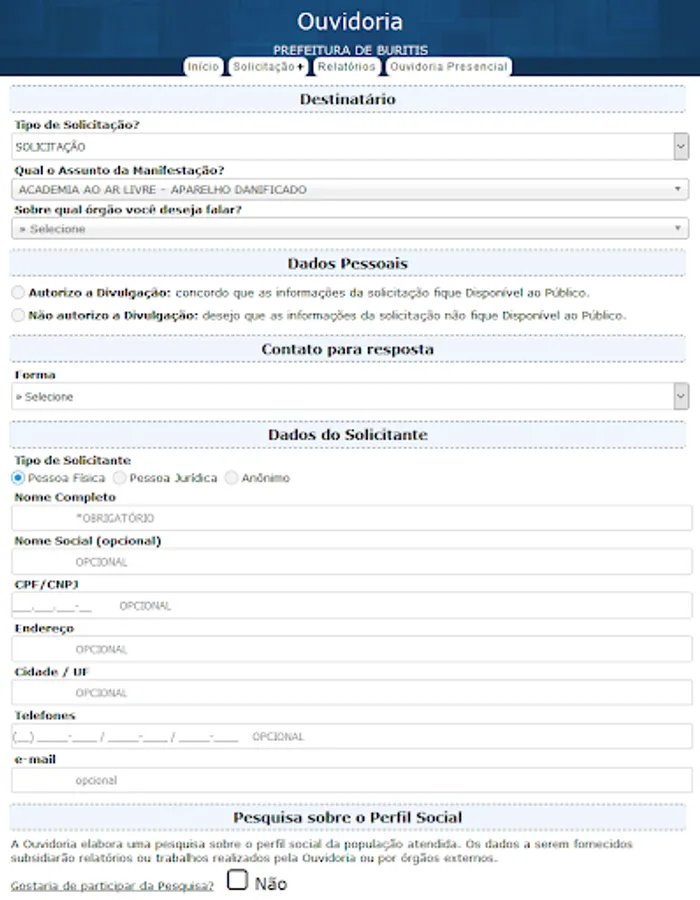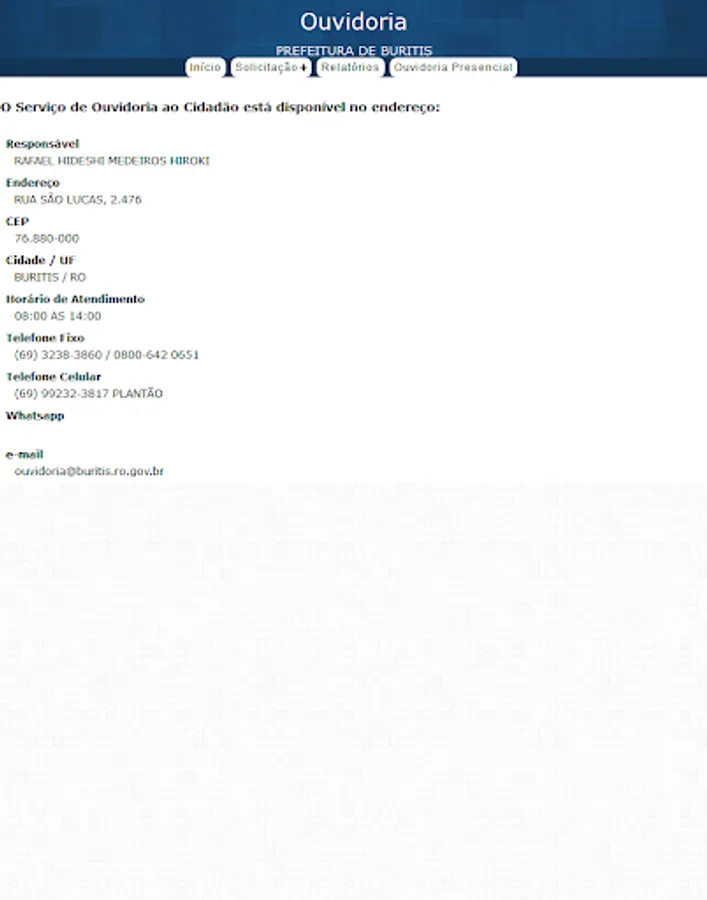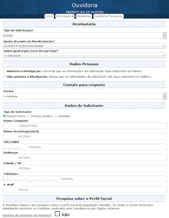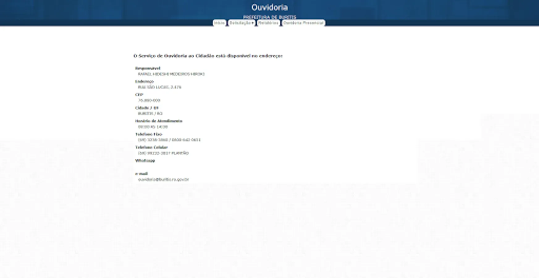 Ombudsman of the Municipality of Buritis-RO, a computerized tool of social control made available to the citizen. Through the Ombudsman's Office it is possible to clarify doubts, as well as forward complaints, complaints, suggestions and compliments, including attachments such as photos, documents, etc. The manifestations registered in this channel are directed to the Ombudsman and the citizen for follow-up.