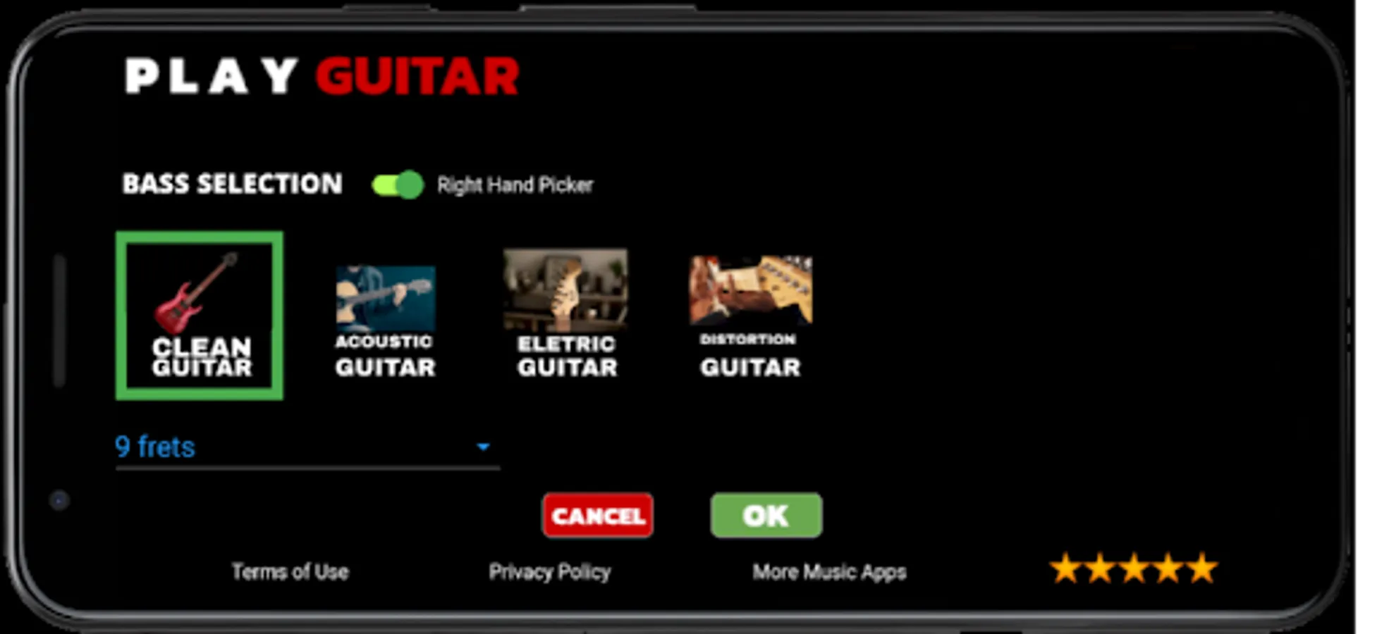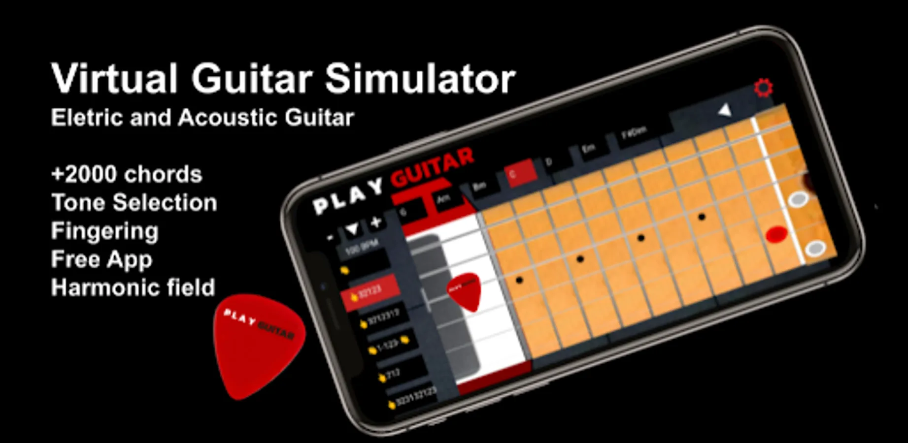 Feel to power of play a virtual guitar instrument in your mobile phone. Play your favorite music, tabs or riff in your virtual guitar with your band.