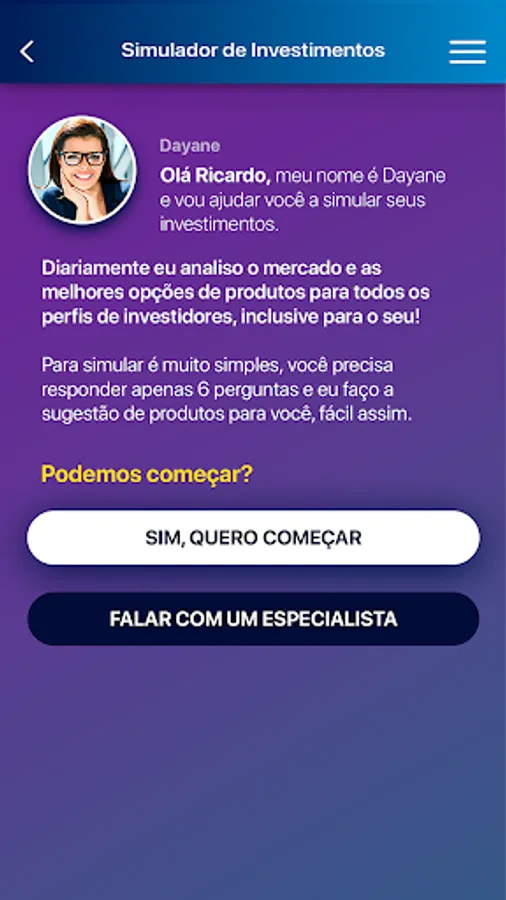 Answer a few questions and see what our virtual assistant Dayane suggests for your investor profile