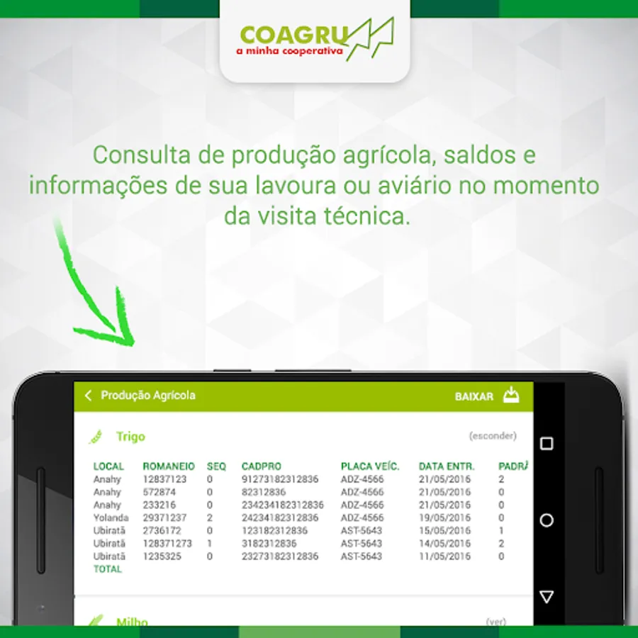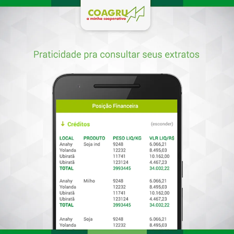 With COAGRU application, you have access to your checking account at the Cooperative and can verify transactions as moving consultation, balances, duplicate salaries, extracts, production deliveries, sorting, etc., will also receive real-time information about drive in your account, as well as their farming or poultry at the time of technical visit.