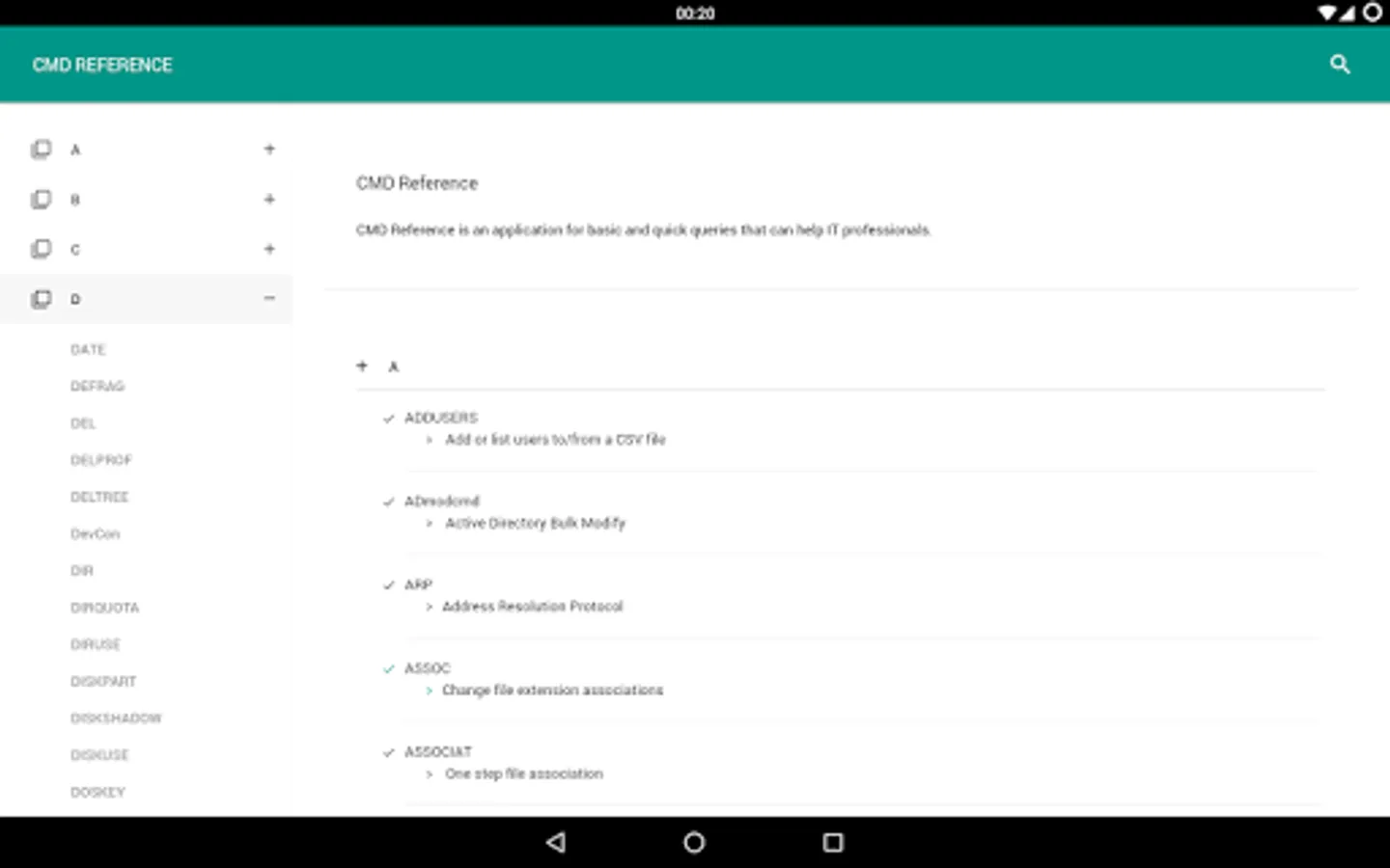 CMD Reference is an application for IT professionals and students, making them better in the knowledge of Windows CMD (MS-DOS).