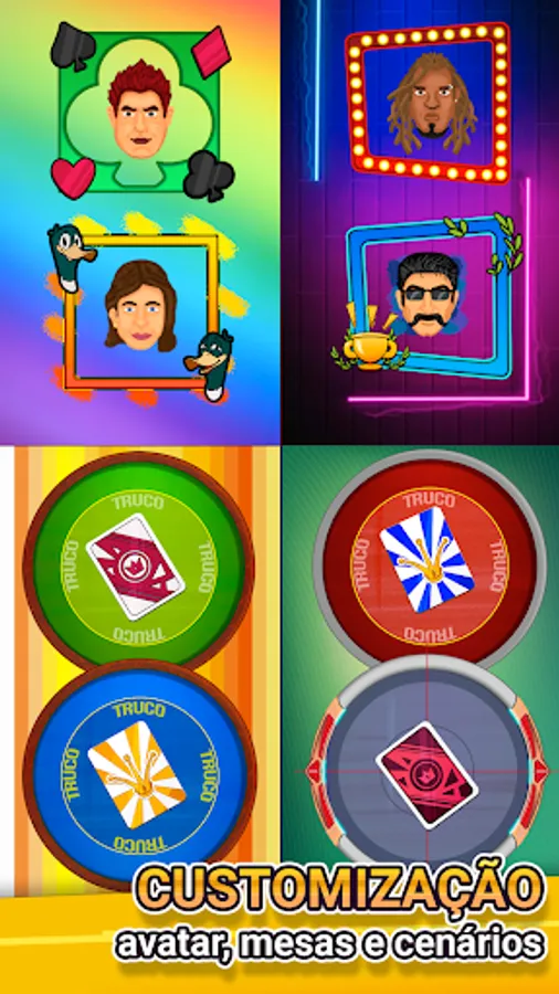 You can customize your room to play truco! Customize the scenarios, tables and playing cards! It also has trickster frames, and tricksters that pass very realistic truco signals!