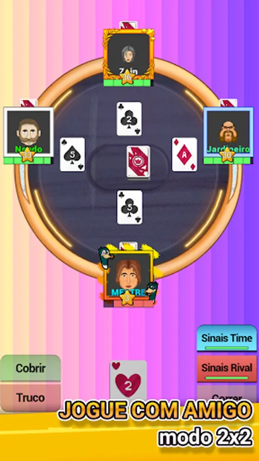 Play Truco Free without any bets! In our truco game you play just for fun, leisure, hobby and pastime. Play truco on your way back from work, play truco on your lunch break or afternoon snack!