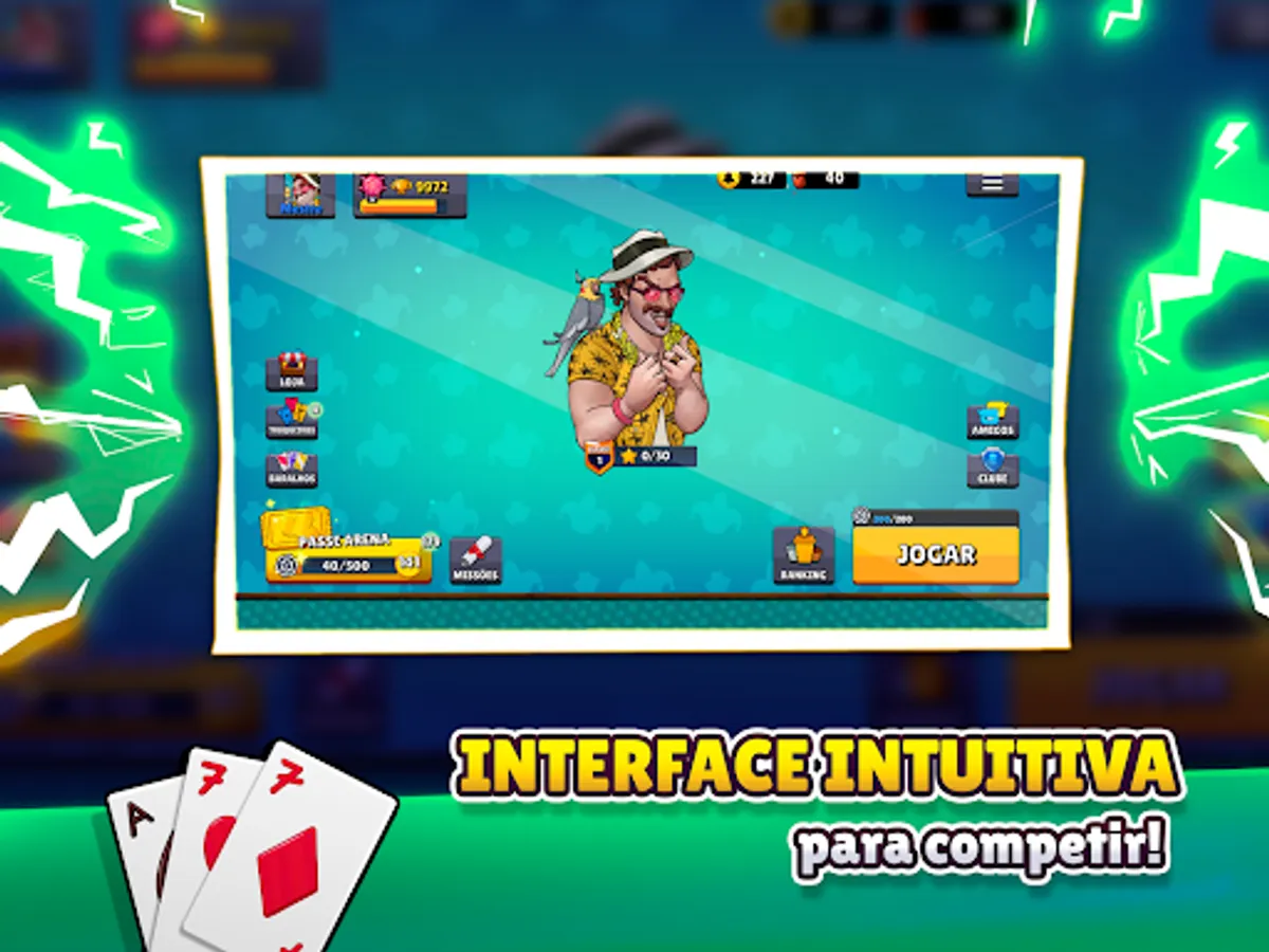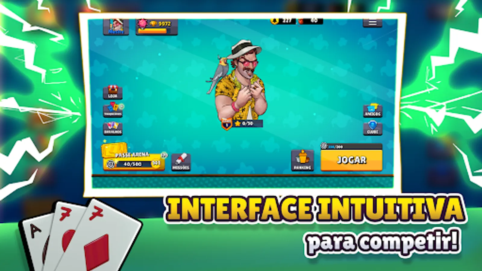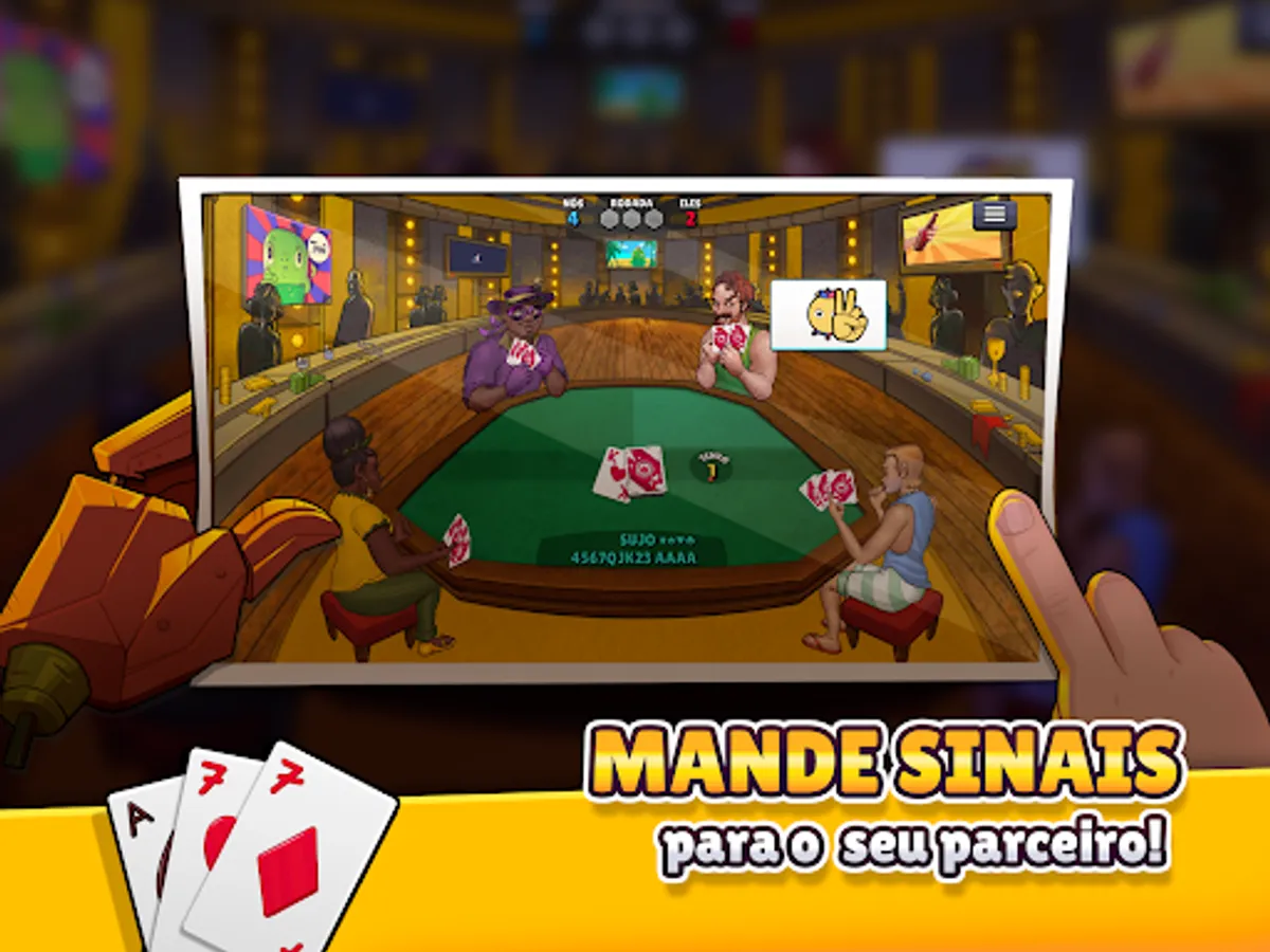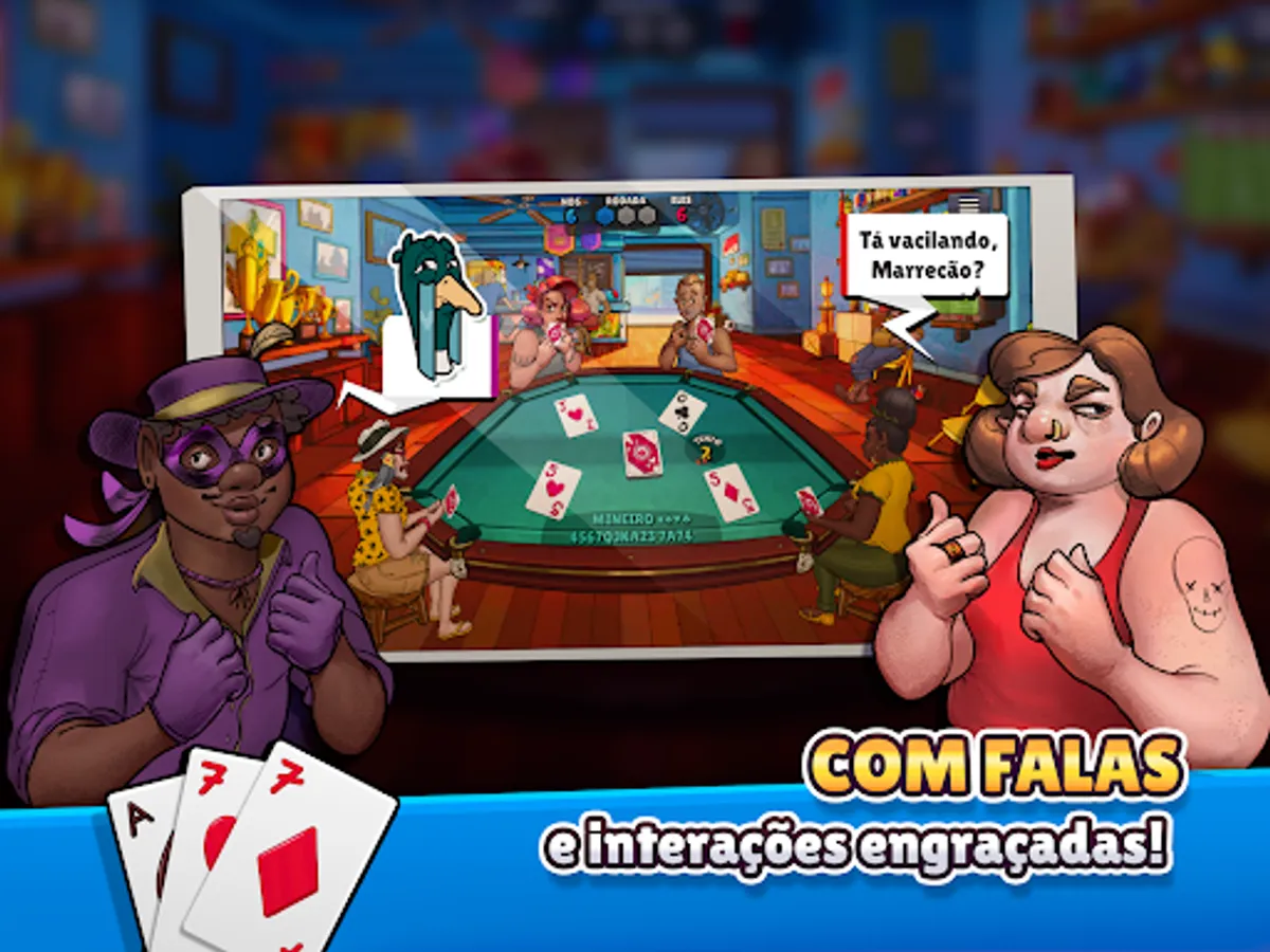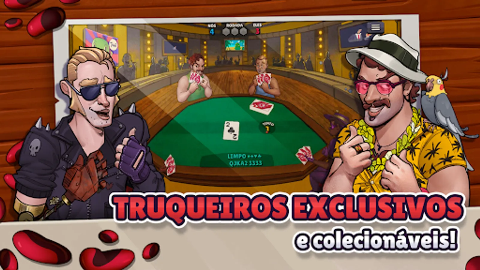 With exclusive characters inspired by the different regions of Brazil, with names from the Truco universe, voices, gestures and typical speeches: you'll have fun tricking and teasing your opponents, and still be able to communicate a lot with your truco partner by sending card signals and communicating with phrases that only he can hear, in order to create a strategy to surprise and defeat the opposing ducks in online truco!