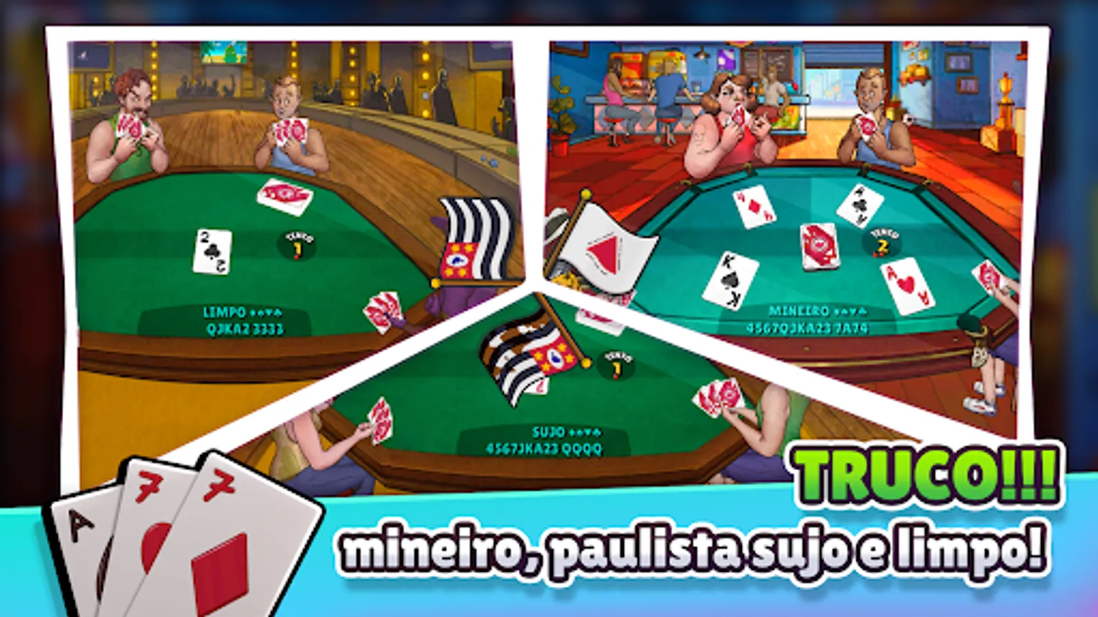 Here you can play Truco Mineiro (with fixed shackles), and play Truco Paulista (with turns on the table)! In addition to the two modalities, in Truco Paulista, we have the option of playing with a dirty deck (complete with 40 cards) and a clean deck (with only the QJKA23 cards)