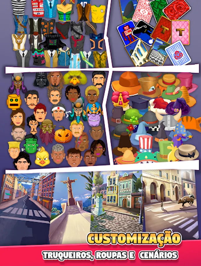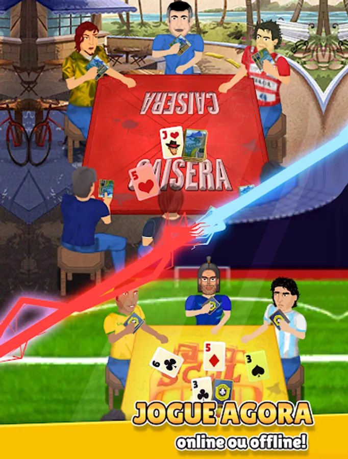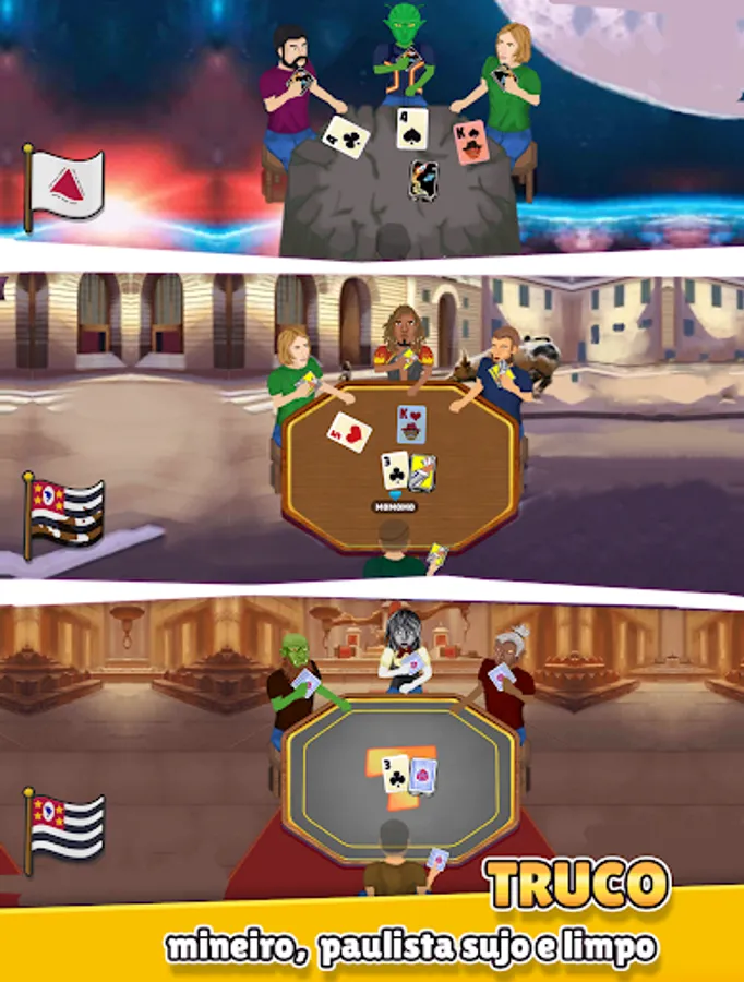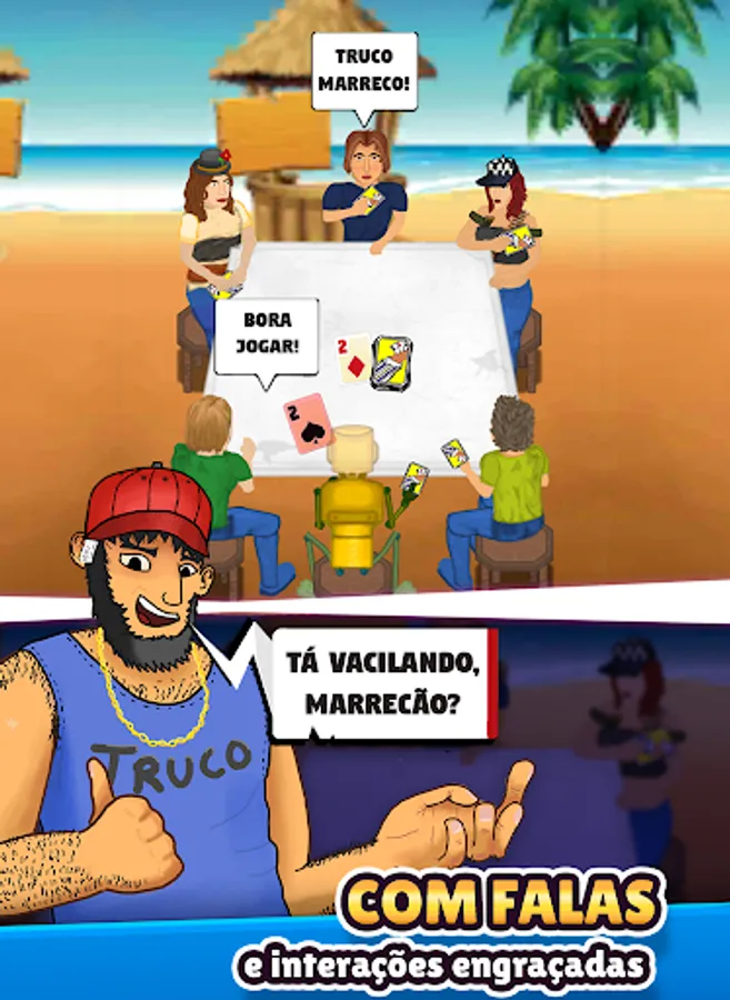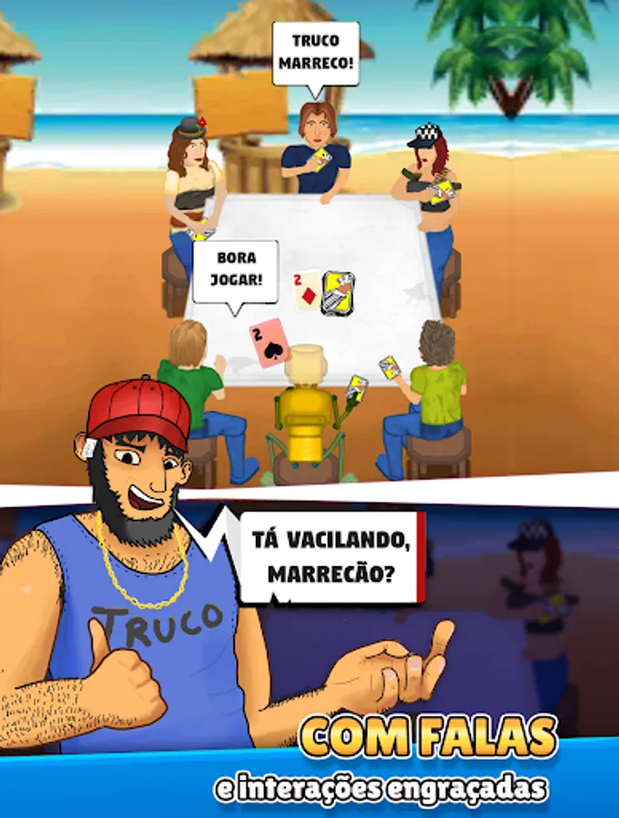 The first and only Truco game for mobile that is really animated! You can play in ONLINE mode (against other reals), and OFFLINE (against artificial intelligence), and even choose which mode you prefer: Truco Paulist and Truco Mineiro. The game has more than 100 characters for you to collect, being possible to customize your clothes and persevering!