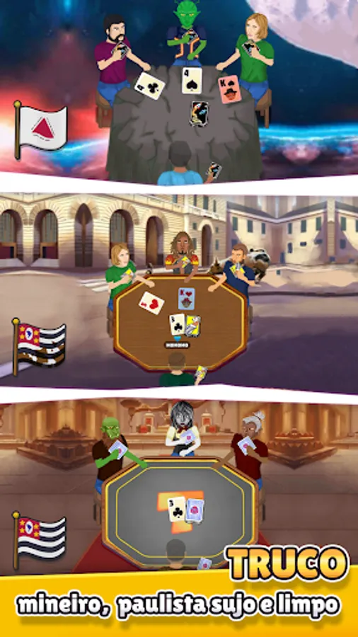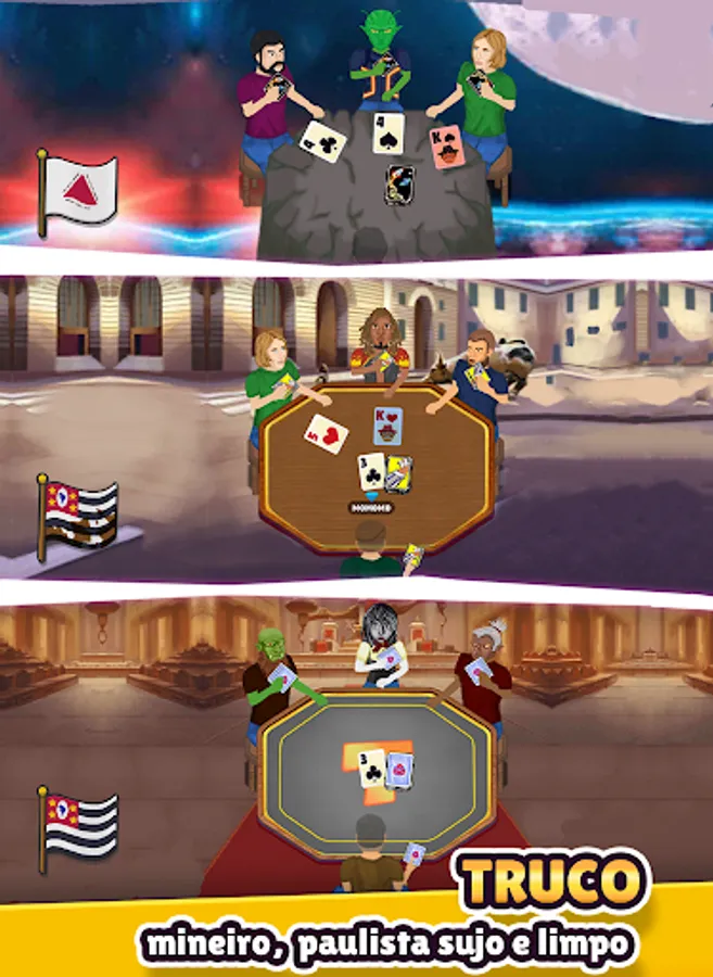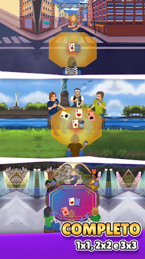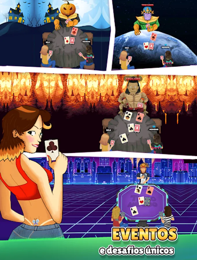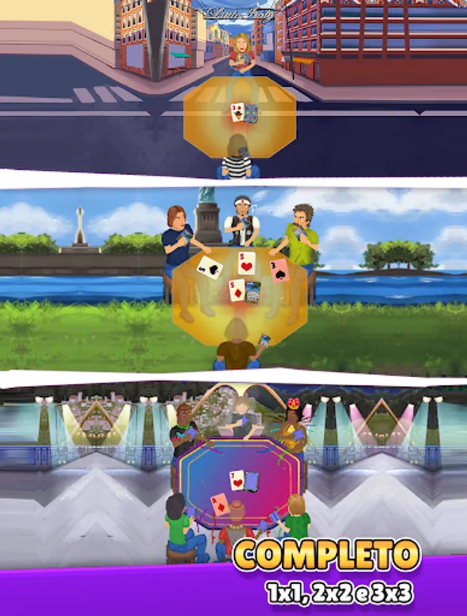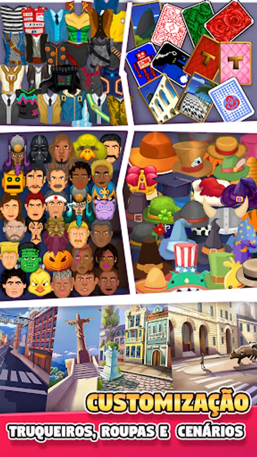 The first and only Truco game for mobile that is really animated! You can play in ONLINE mode (against other reals), and OFFLINE (against artificial intelligence), and even choose which mode you prefer: Truco Paulist and Truco Mineiro. The game has more than 100 characters for you to collect, being possible to customize your clothes and persevering!