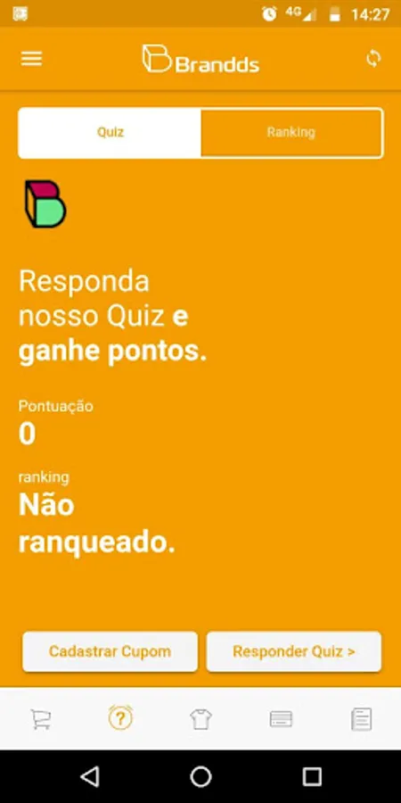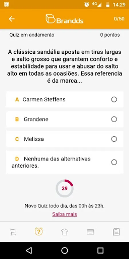 Entertainment: When purchasing (investing) at www.brandds.com.br, at the Brandds App, or at the Brandds Store, the user-client is automatically validated. That done, each user will have the right, for one month, every day, until 11:59 pm on that day, to answer 30 (thirty) general knowledge questions in the question and answer game. Each question will have a time of 40 (forty) seconds to be answered and a score of 10 (ten) points. The user can monitor his performance and that of others in the "ranking". He can also check the ranking of previous days on the calendar. If there is more than one winner in the total of points, the voucher amounts will be divided equally in the virtual Brandds Card of the users.