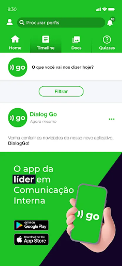 Dialog Go is an Internal Communication platform developed by Dialog, the #1 startup in Internal Communication in Brazil. In this app, you will be able to learn about the tool's functionalities and discover how these resources can transform your company's CI, awakening the long-awaited engagement in communication actions and including all people in a single digital channel.