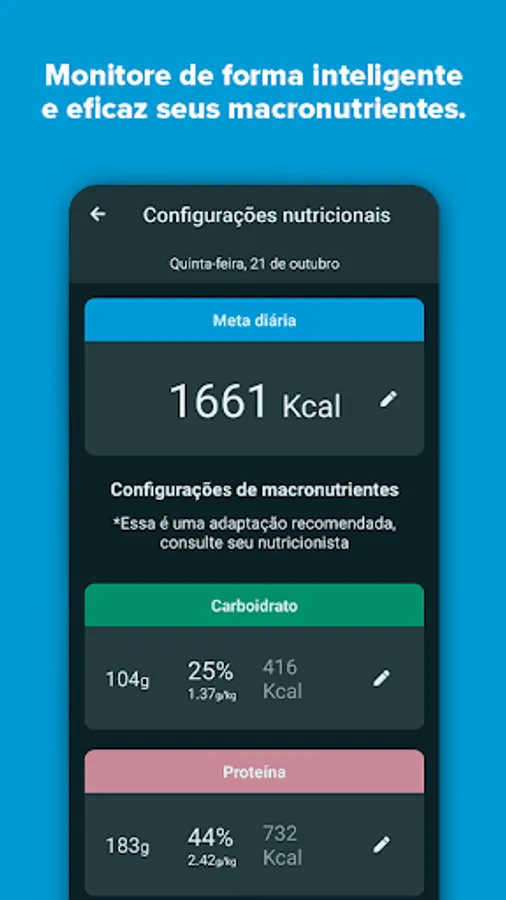 Intelligently and effectively monitor your macronutrients: carbohydrates, proteins and fats.