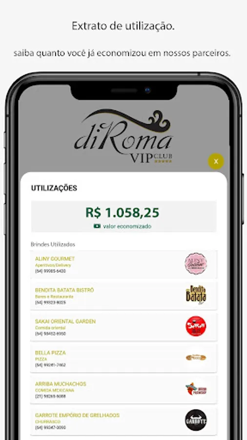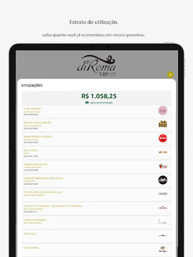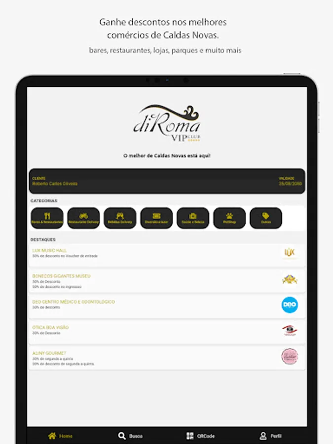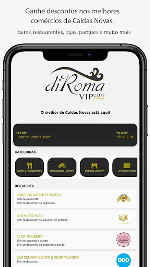 The diRoma VIP Club + (DRVC+) Advantage Club is an exclusive application for DRVC customers, which allows its members to consult and enjoy numerous benefits and advantages at various establishments in the city of Caldas Novas.
