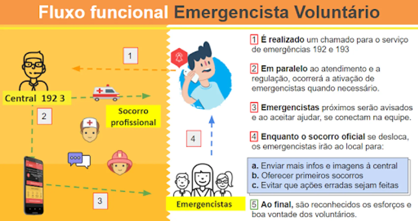 The operation is simple and powerful: while regulation dispatches professional help, in parallel volunteers within 1km radius are activated to help and contribute if they can by accepting the call.
