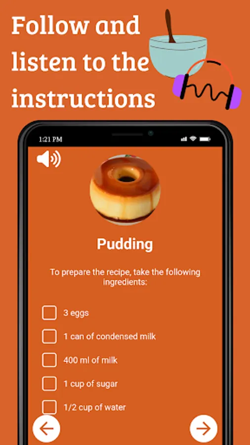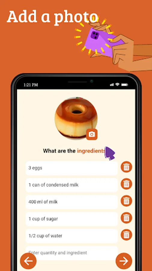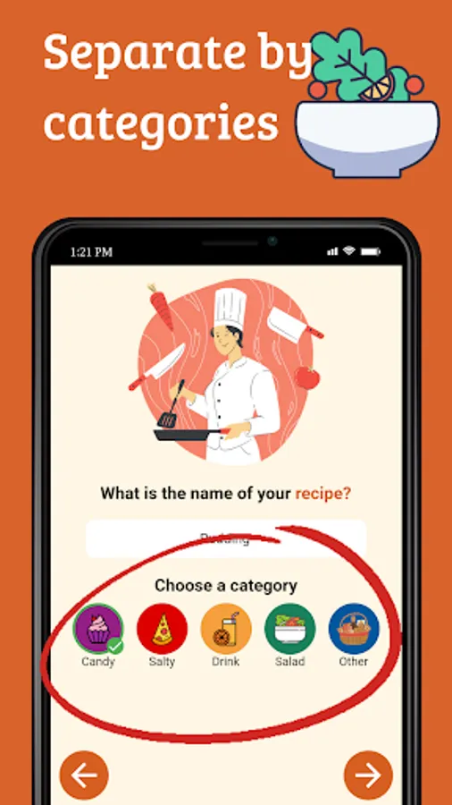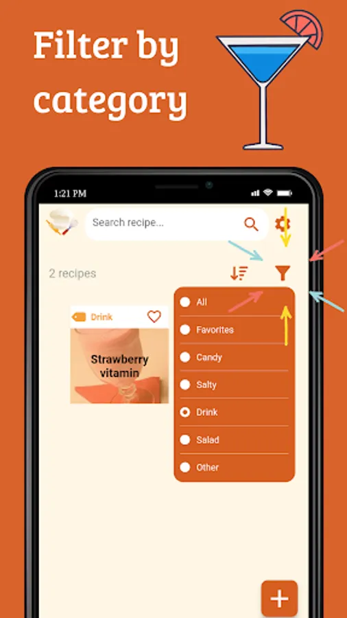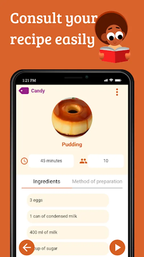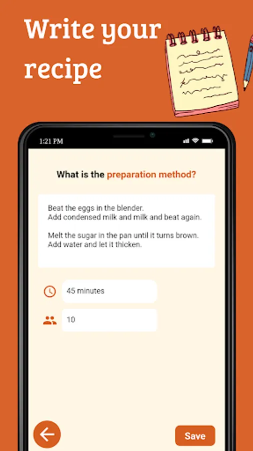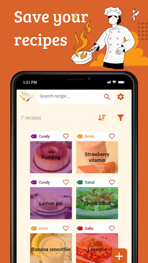 Create a recipe noting: ingredients, method of preparation and category (sweet, savory, drink, salad or other). Access them wherever and whenever you want, without needing an internet connection.