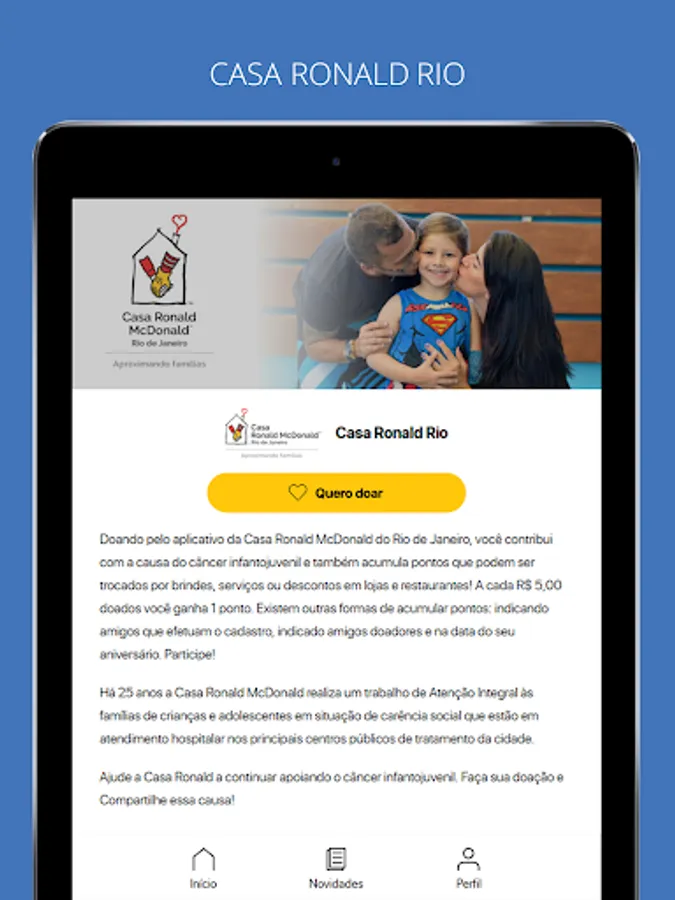 By downloading the Casa Ronald McDonald app from Rio de Janeiro you will contribute to the Institution to donate quality of life and well-being to families during the treatment period and to maintain future social projects.