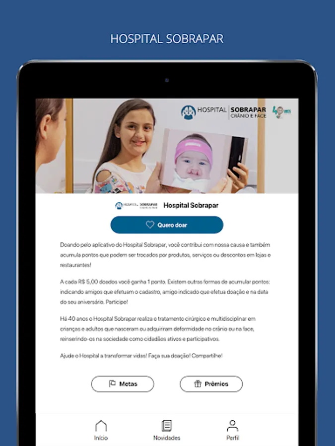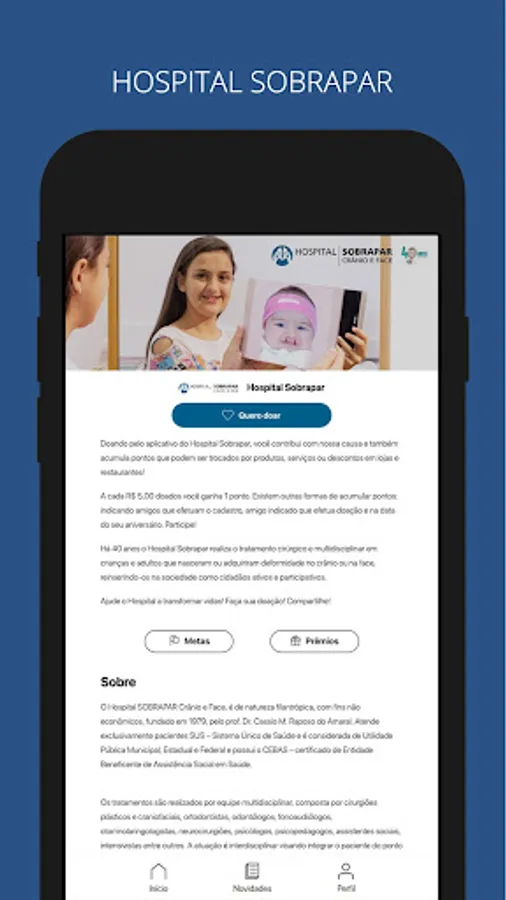 By downloading the SOBRAPAR app you will contribute to the reference philanthropic hospital in the country and help keep its doors open. For 40 years, the SOBRAPAR Hospital has performed surgical and multidisciplinary treatment in children and adults who were born or acquired deformity in the skull or face, reinserting them in society. The performance of SOBRAPAR is interdisciplinary aiming to integrate the patient from the functional, psychological, social and vocational point of view, promoting their well-being and their families, making them active, full and rehabilitated citizens.