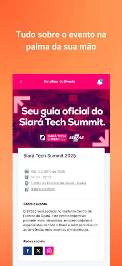 Experience the Entrepreneur Fair and Siará Tech Summit in the palm of your hand! Connect interactively, immersing yourself in a complete experience, all in one place. Incredible features await you: