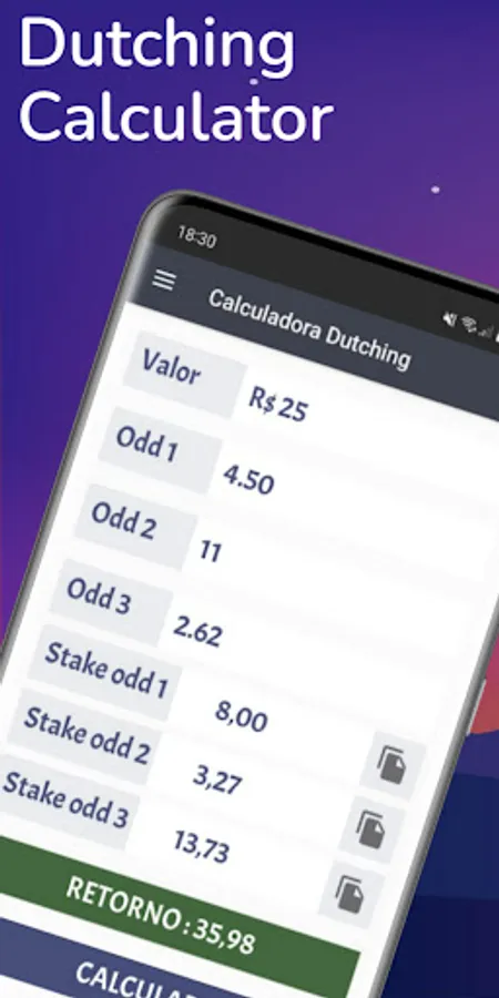 Our app is intuitive and user-friendly, allowing you to input the odds of different events and instantly obtain the optimal bet amounts for each selection. Additionally, the Dutching Calculator offers advanced features such as the option to adjust the desired profit margin and distribute bets across multiple selections.