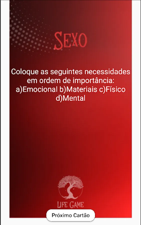 There are 5 categories (Life, Sex, Relaxation, Spirituality and Love) and each category has 30 selected questions and 3 open questions.