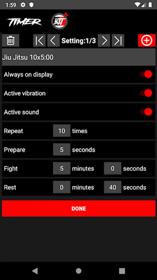 Interval Timer focused on Jiu-Jitsu fights / training, with configurations of vibrating and audible warnings.