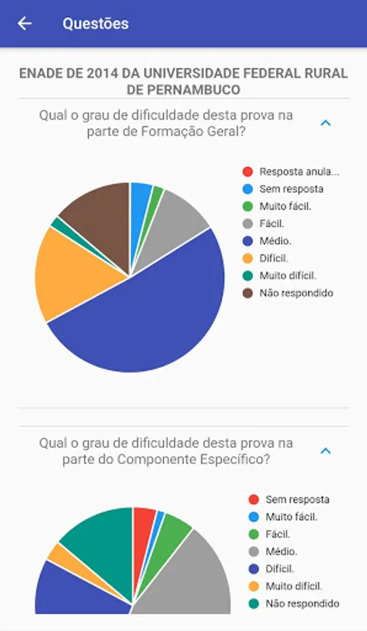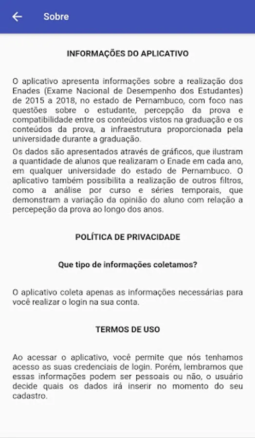 The application presents information on the completion of the Enades (National Student Performance Exam) from 2015 to 2018, in the state of Pernambuco, with a focus on questions about the student, perception of the test and compatibility between the contents seen in the undergraduate and the contents of the proof, the infrastructure provided by the university during graduation.