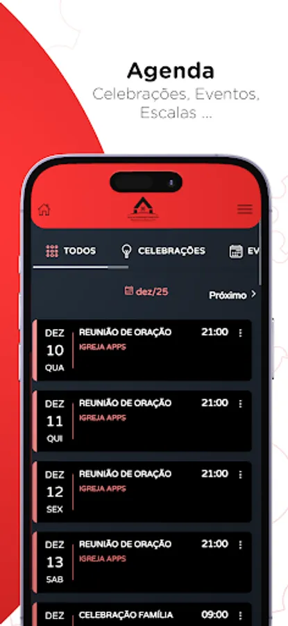 ⛪ Calendar: See a complete calendar of Services, Events, your Schedule in Church Ministries/Departments;