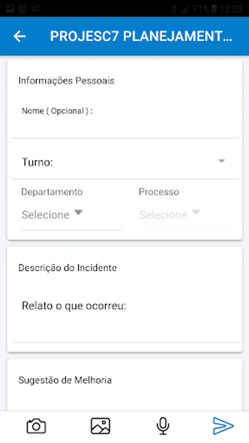 The purpose of this application is to allow people involved in industrial processes to be able to record incidents in a practical and quick way, alerting those responsible in the sector that a certain situation has occurred, evidencing with images and audios.