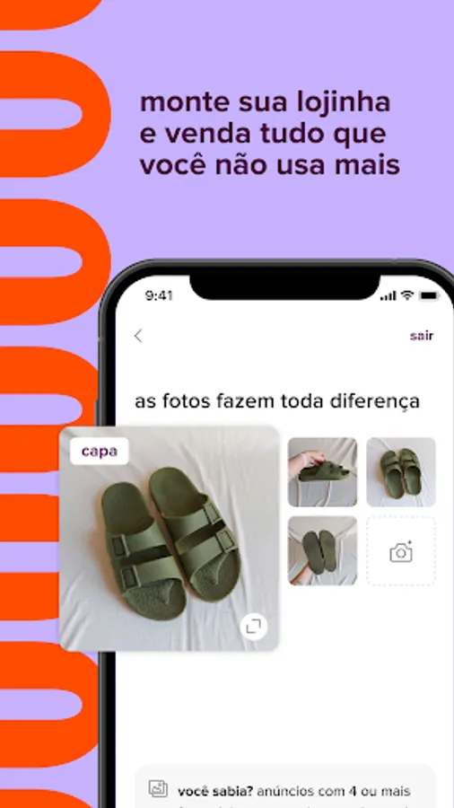 first step, have a cell phone at hand and download the app. after that, start photographing the detachments, which can be used or never used, be it clothes such as blouses, outerwear, pants, t-shirts, shirts or sandals, bag or accessories, make the ad in the application with an engaging description and that's it! just wait to do business and see your enjubank billing.