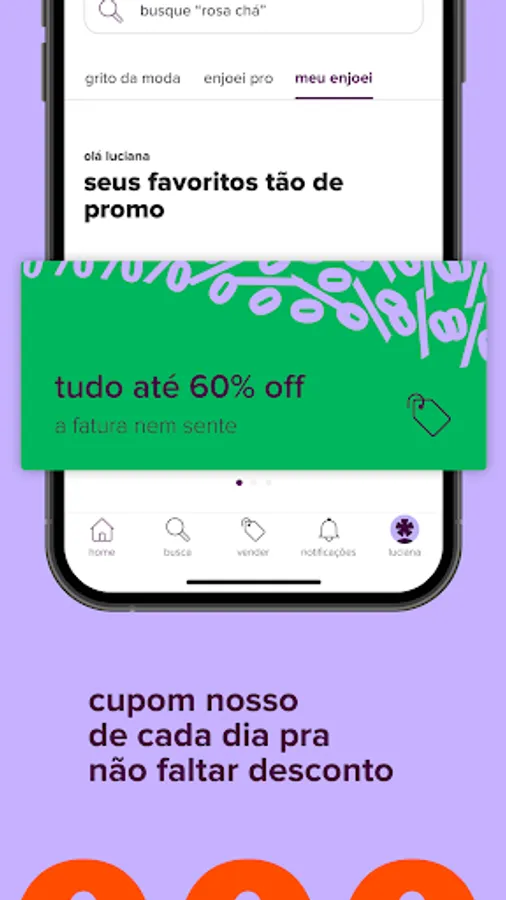 there are more than 5 million products, all to guarantee a wide variety of styles. thinking about your pocket, enjoei always provides exclusive promotions and offers from the best brands with notifications of exclusive discounts on enjoei everything can be customized according to your preferences. on the wishlist you have access to all the products you loved the most, be they clothes, bags or shoes. What are you waiting for to give a yeah yeah on home, decor, beauty or fashion items online?