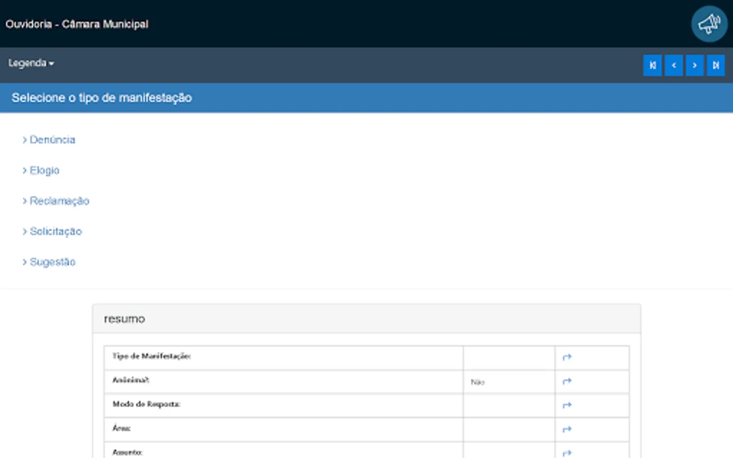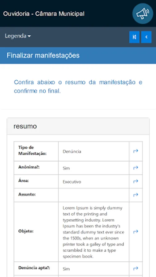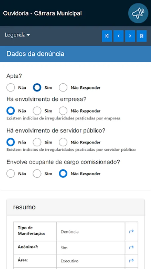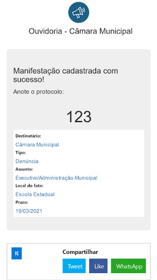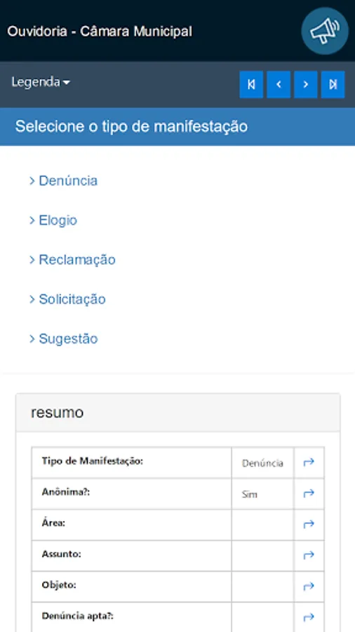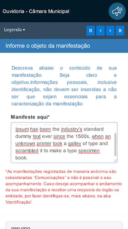 This application is intended for receiving and monitoring public manifestations of citizens with the Ombudsman, in compliance with Law 13.460 / 2017.