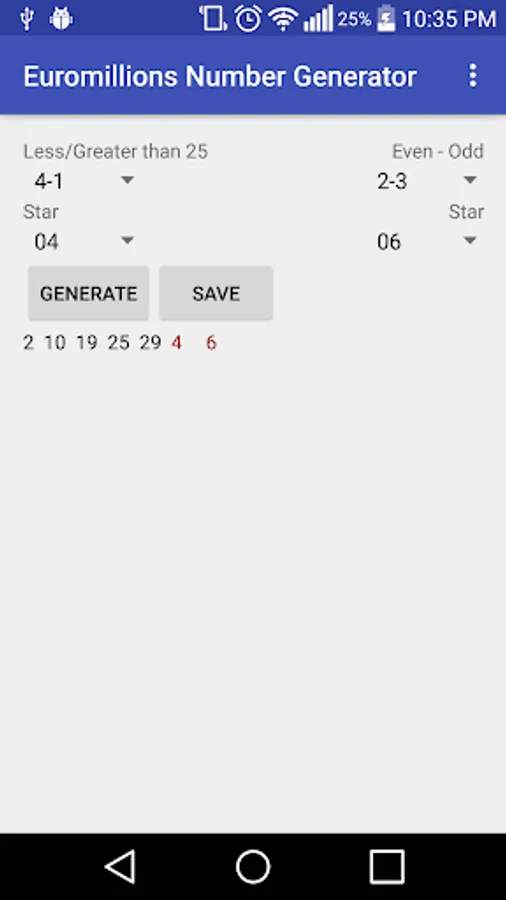 The app provides the generation of numbers to Euromillions Lottery according to user's choice about even / odd numbers and greater or less than 25 numbers