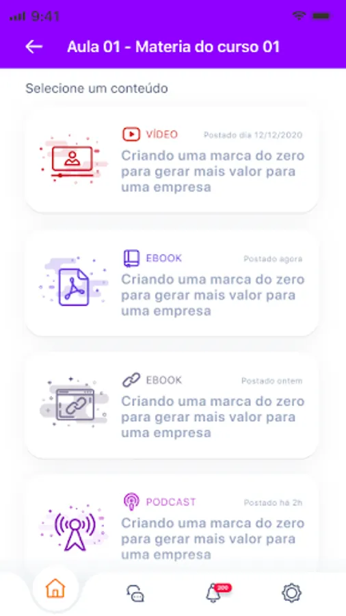 - Videos: It is also possible to provide videos of content or even recorded lessons, which the student can access through a filter by date. They reinforce what was shown in the classroom and allow the student to review the class if needed.