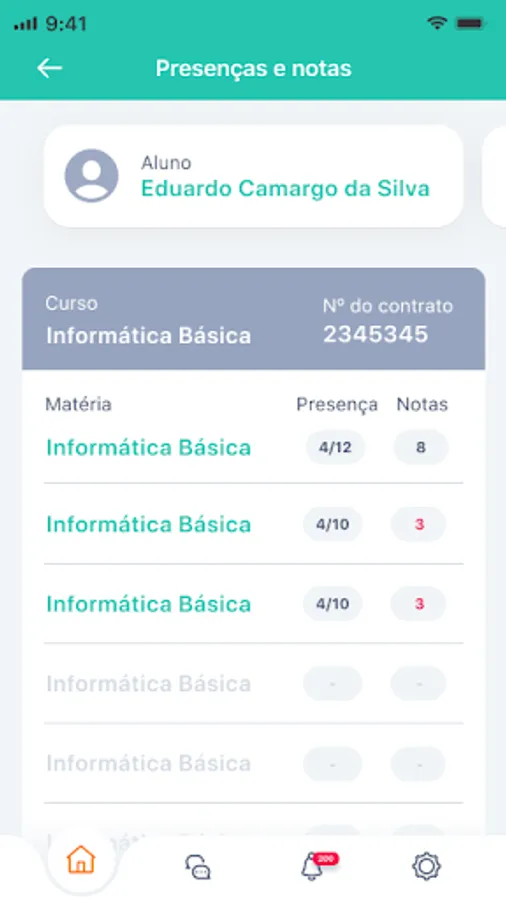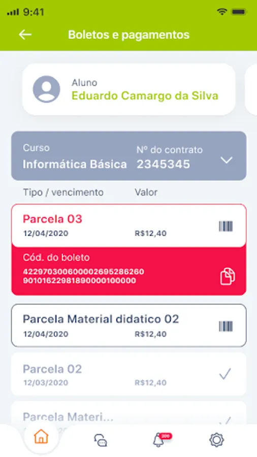 Financial Situation: This tab contains a history of monthly payments and installment situations, in addition to other payments such as teaching material, enrollment, etc. The application uses a colored tag that signals whether they have been paid or are overdue. It is possible to clearly view the amounts, payment dates and specifications of debits.